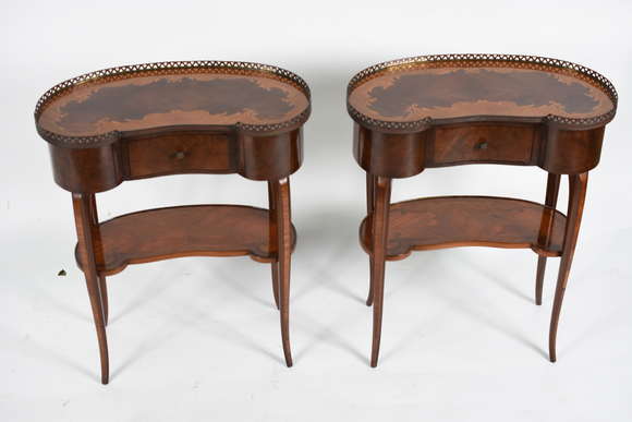 Par de mesas de madeira nobre feitio" rim ", galerias de metal, pequenas pranchas laterais retráteis .