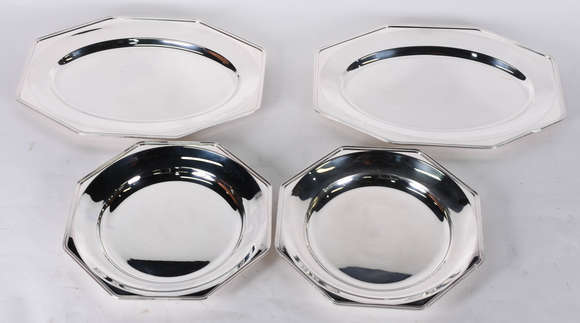Faqueiro de prata 90 WOLFF, desenho "geométrico grego", composto de: 12 facas , 11 garfos , 10 colheres grandes; 10 facas , 9 garfos , 10 colheres de sobremesa ; 12 facas e 1 garfos para peixe ; 10 colheres de chá e 12 para café e 7 peças de servir . Total 115 peças .