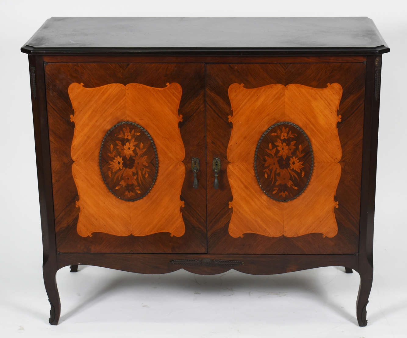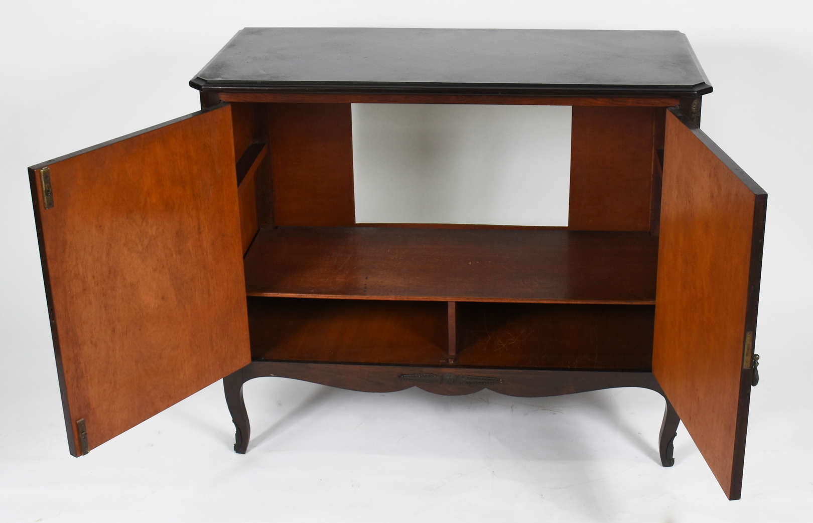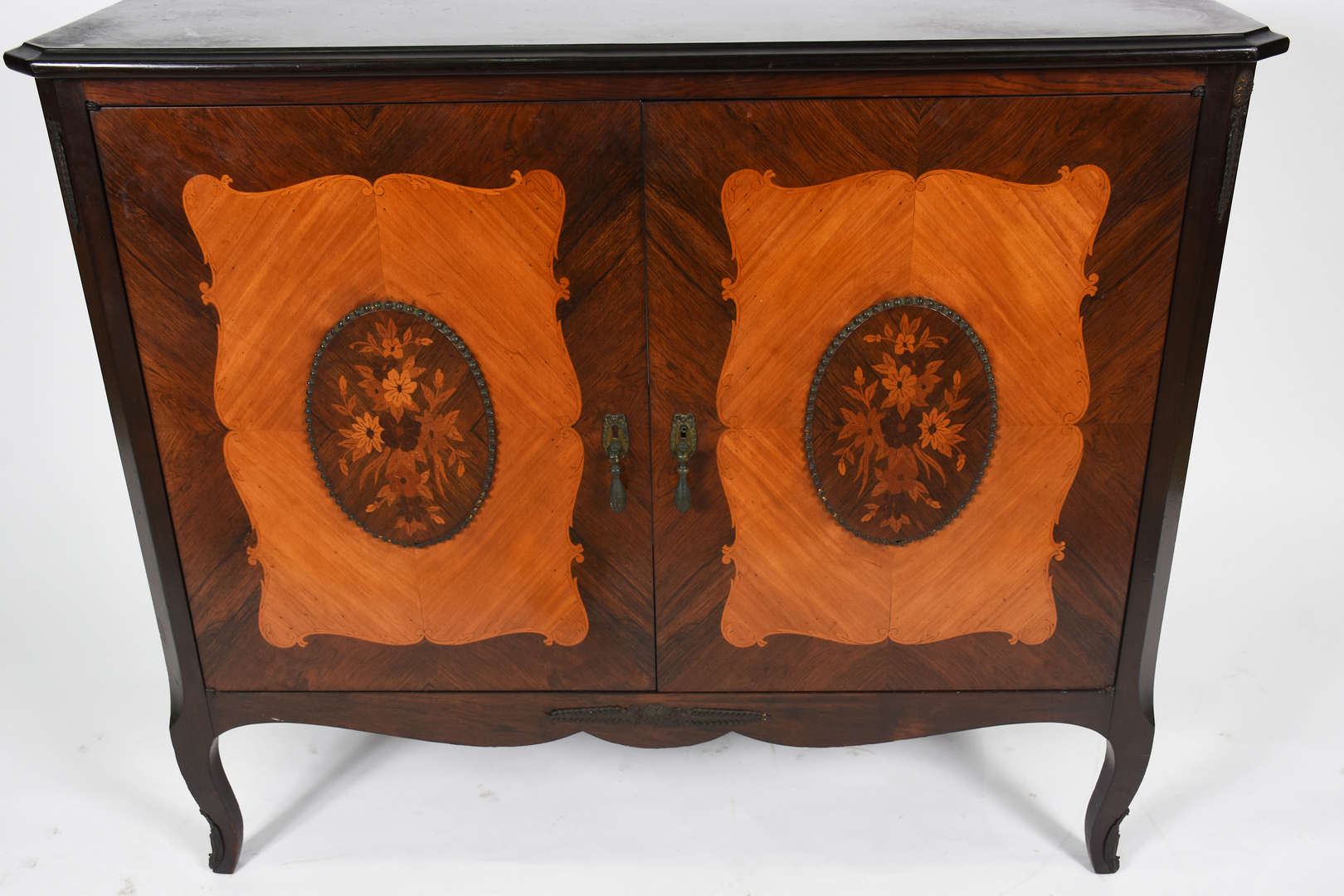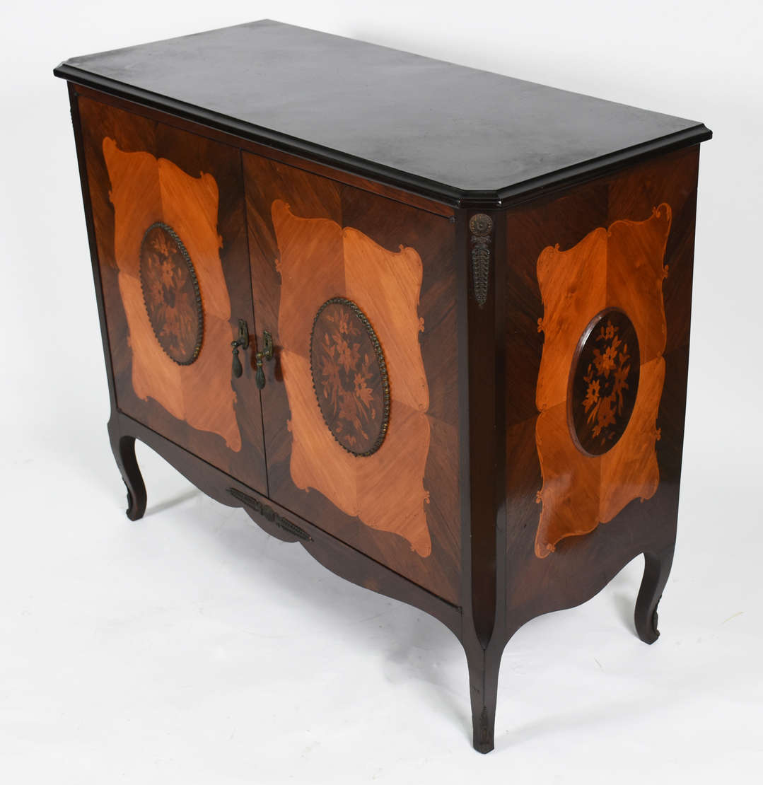 Aparador estilo Império com tampo de mármore verde e detalhes de metal dourado . Platô inferior recortado.
