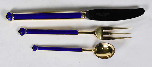 Conjunto de talheres, sendo 6 faquinhas , 6 colheres e 6 garfinhos de sobremesa de prata Sterling 925 norueguesa com ...