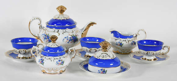 Aparelho de chá de porcelana Schmidt, ricamente decorado com faixas azul cobalto , flores em policromia e realces dou...