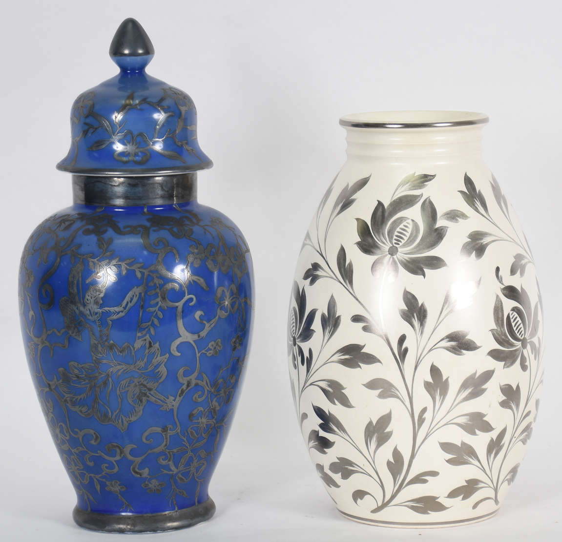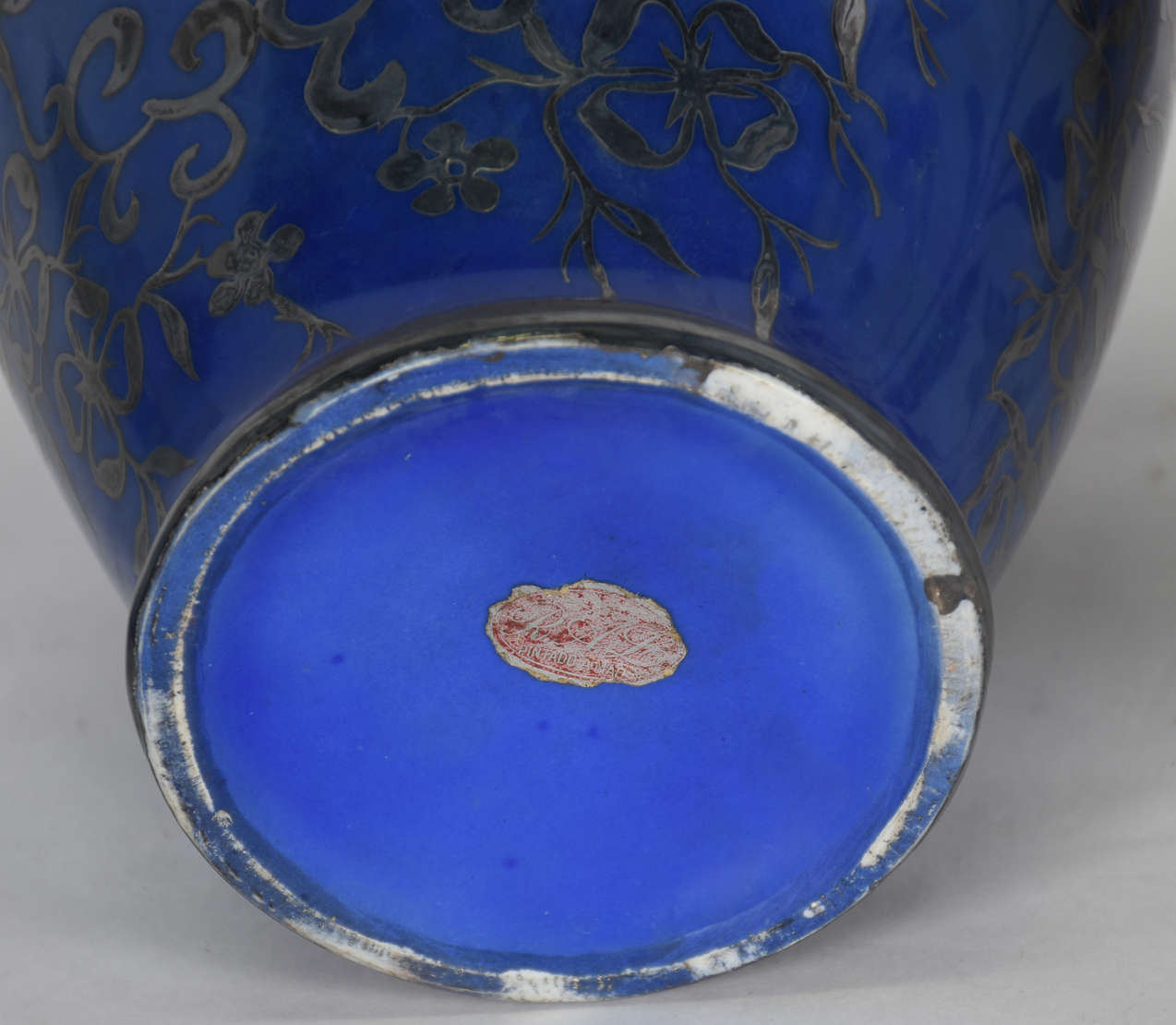 Par de belíssimas ânforas de porcelana Européia azul cobalto ricamente trabalhadas em dourado ( 1 alça colada ), mar...
