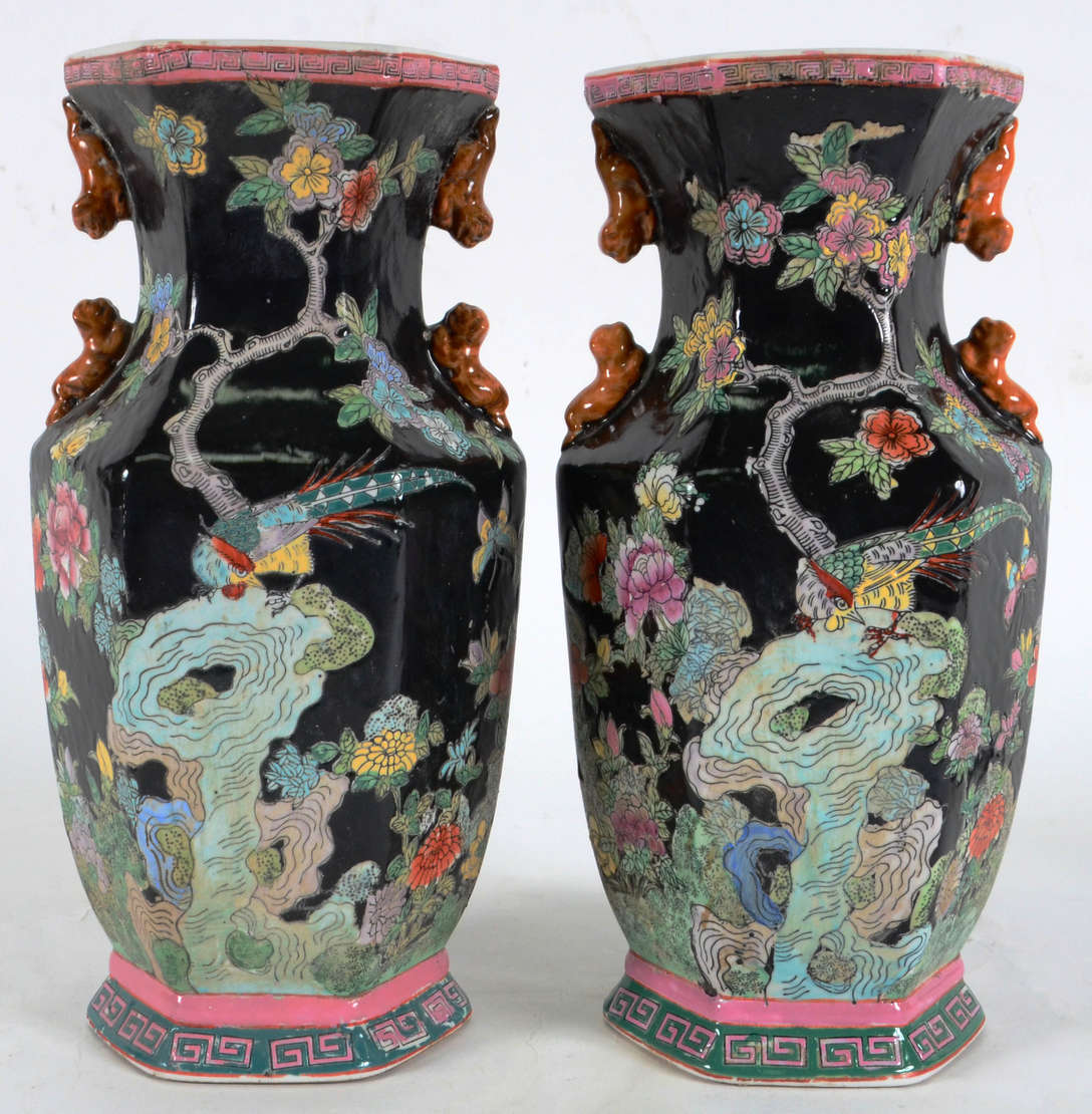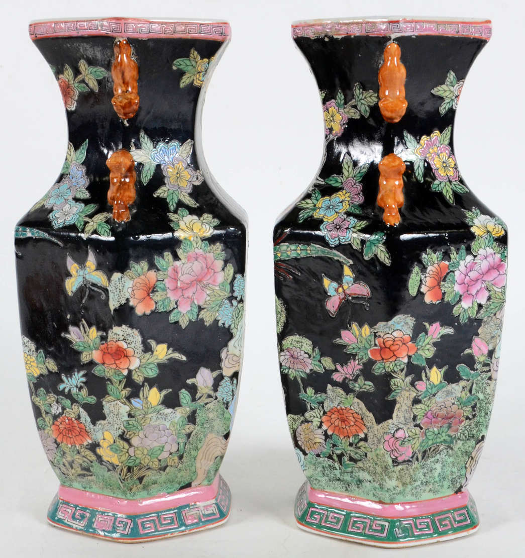 Par de Jarrões – Porcelana chinesa com decoração mandarim nos tons da palheta “Família Rosa” – Bases em madeira doura...
