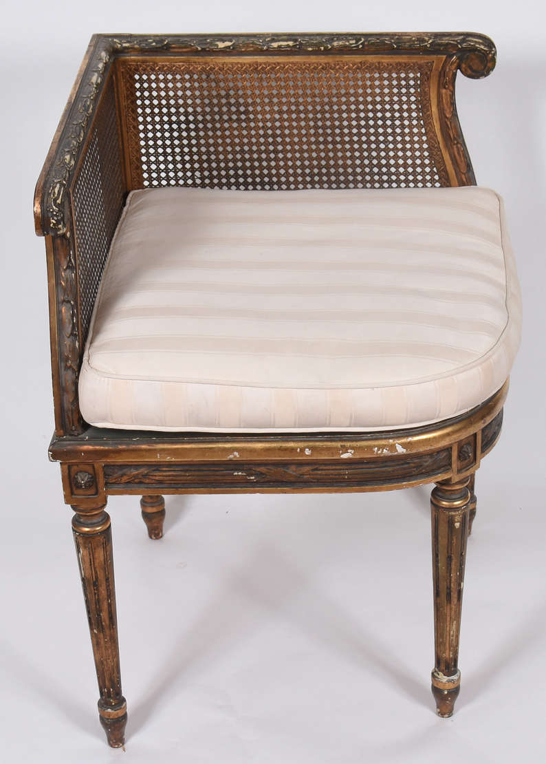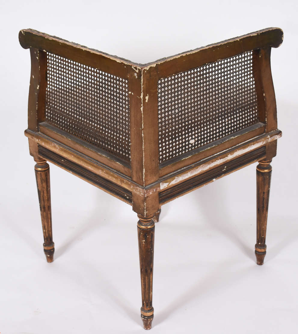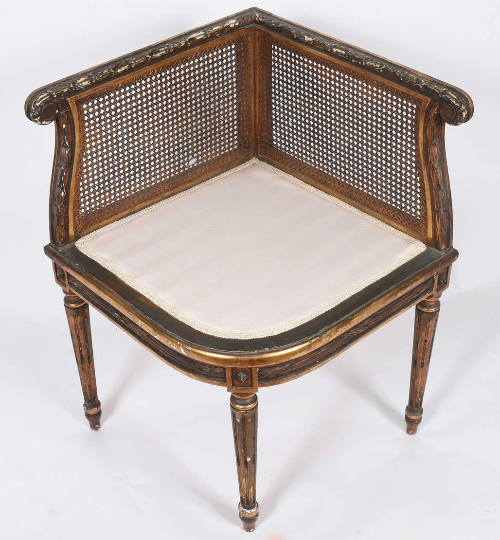 Cadeira de canto – Madeira entalhada e dourada com palhinha no encosto e no assento, acompanha almofada branca nova. Estilo Luís XVI. França – Século XX.