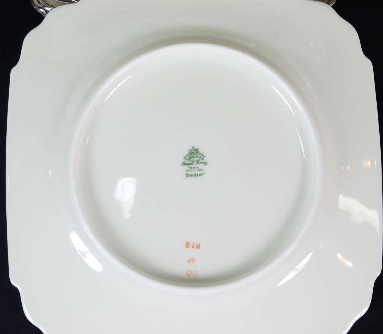 Petisqueira – Opalina branca e pega de prata datada de 1858. Decoração em forma de duas concha com pinturas a ouro. C...
