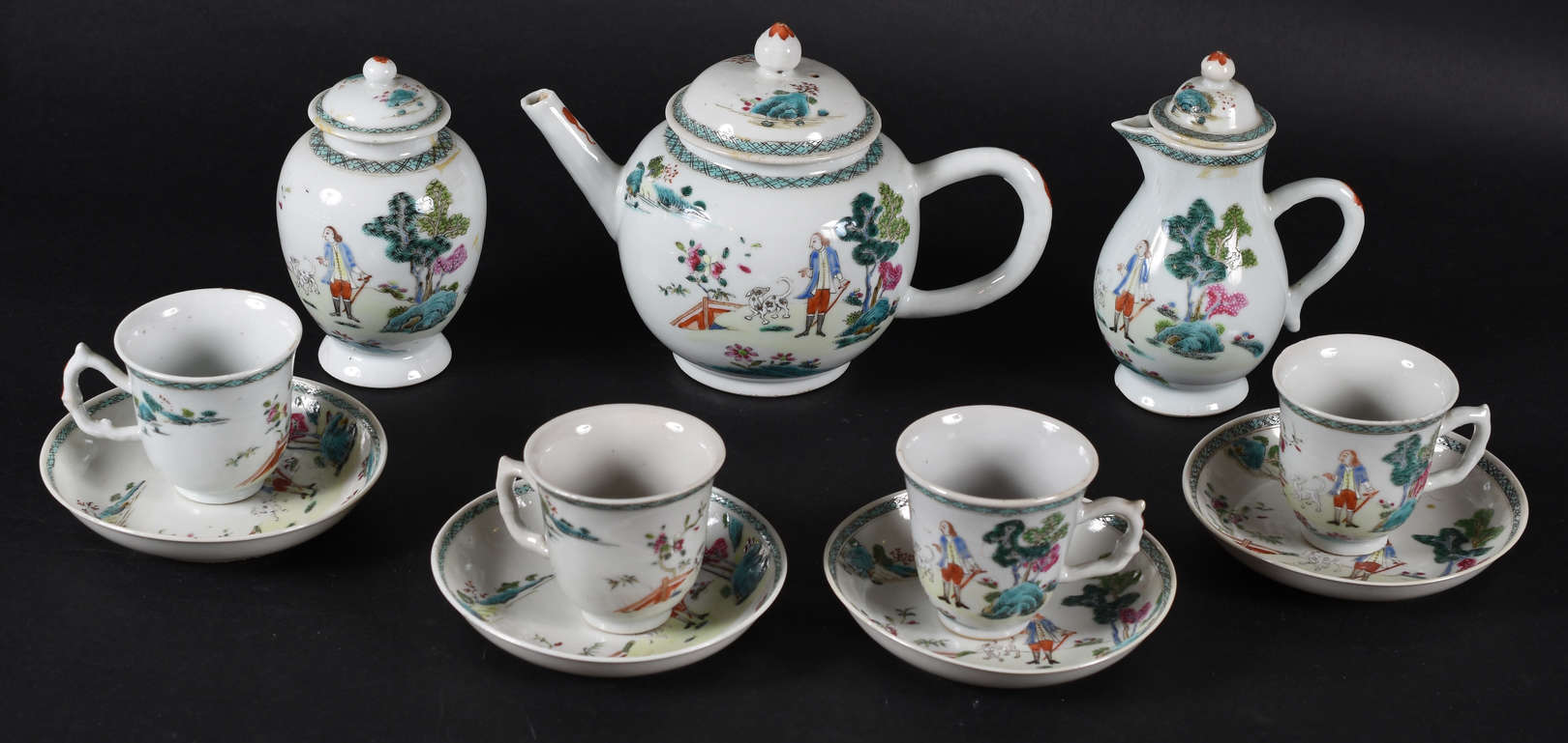 Cia. das Índias – Covilhete e presentoir – Decoração dita “dos pastores”, com figura masculina com trajes europeus em...