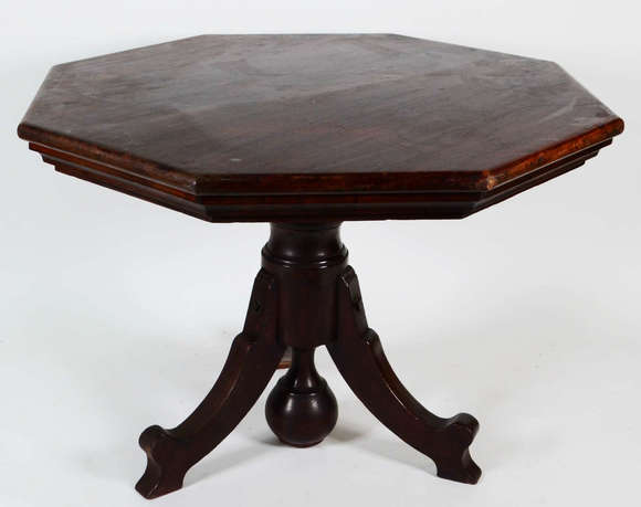 Mesa de Reunião – Jacarandá maciço – Tampo oitavado – Perna central torneada tocando o chão e pés de apoio. Em três d...