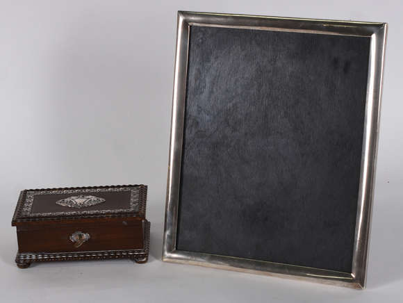 Duas peças , sendo: grande porta retrato com moldura de prata de lei contrastada, e caixa porta jóias de jacarandá co...