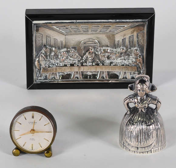 Três peças, santa ceia , campainha de metal e relógio ( relógio funcionando)
