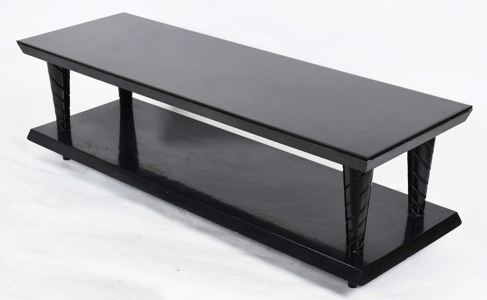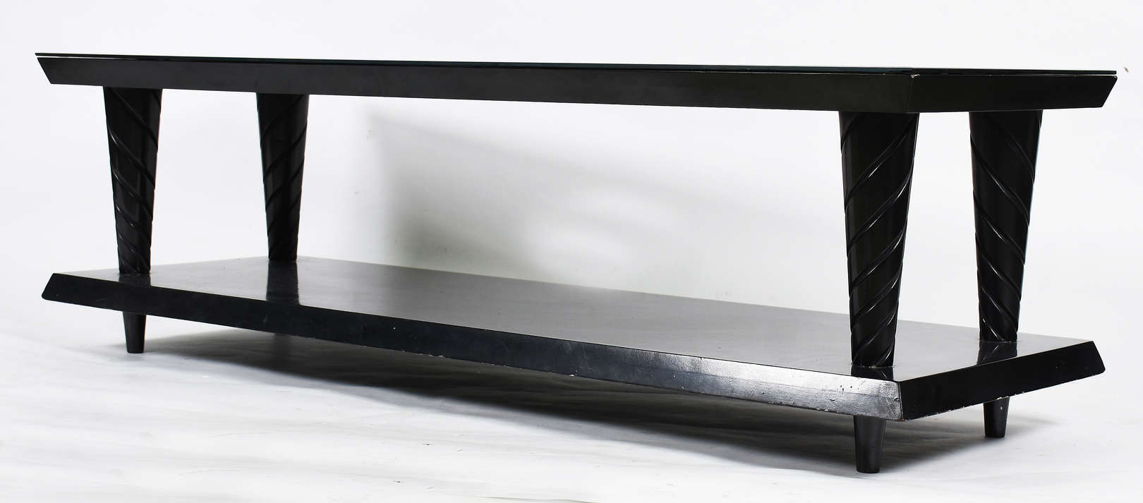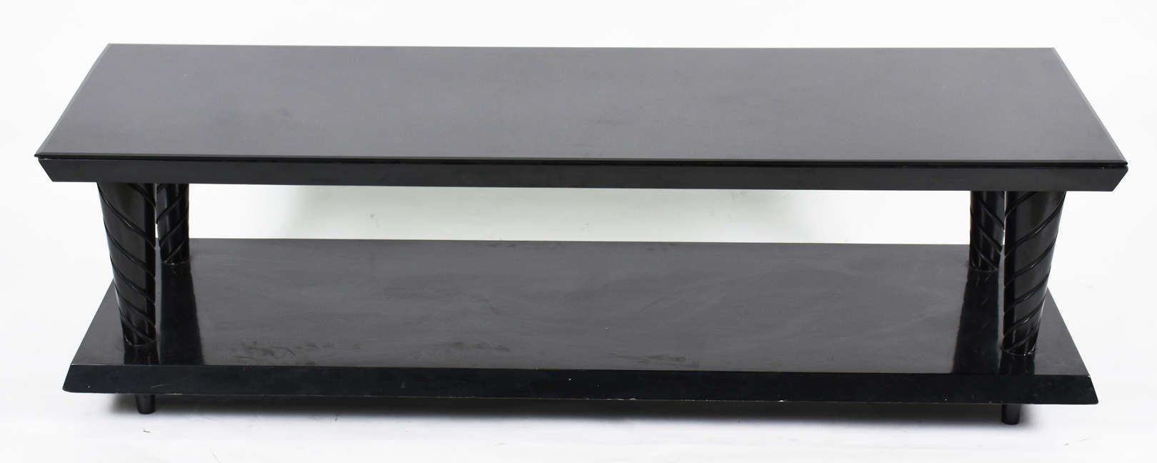 Lote arrematadoLote 397 - Ao vivo! Mesa de centro de madeira nobre, feitio retangular, pernas torneadas ligadas por trave inferior . 40 x 110 x 60 cm