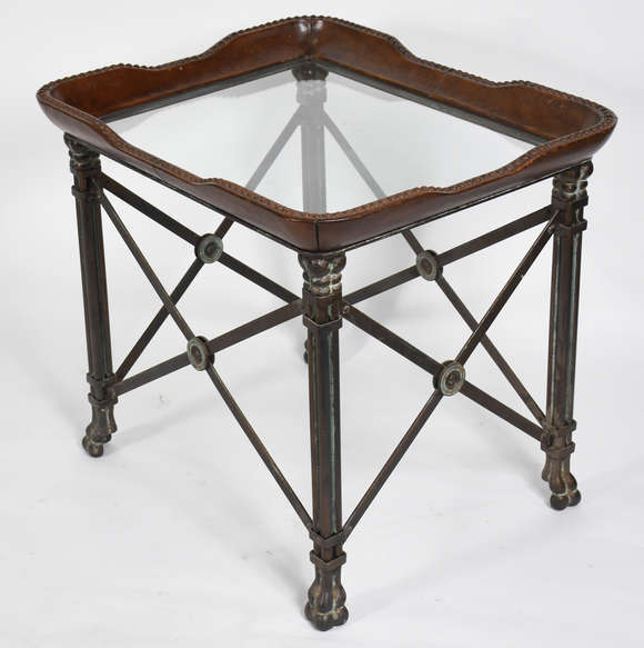 Mesa lateral com pés de metal , tampo de vidro com couro e tacheados .