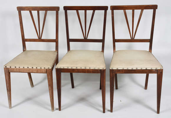 Três cadeiras com assento estofado.