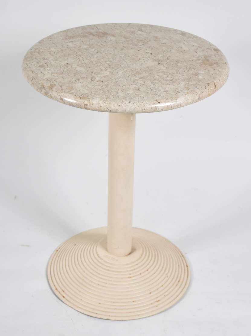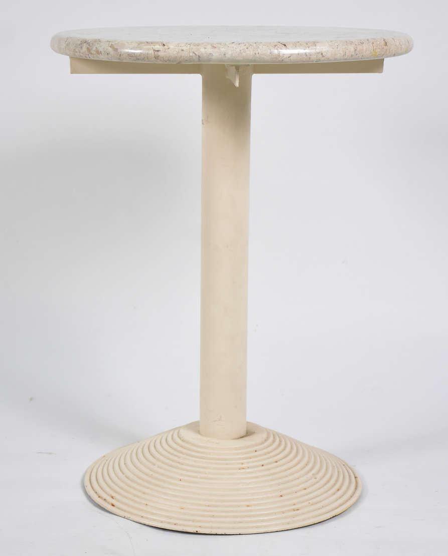 Mesa lateral com pés de metal , tampo de vidro com couro e tacheados .