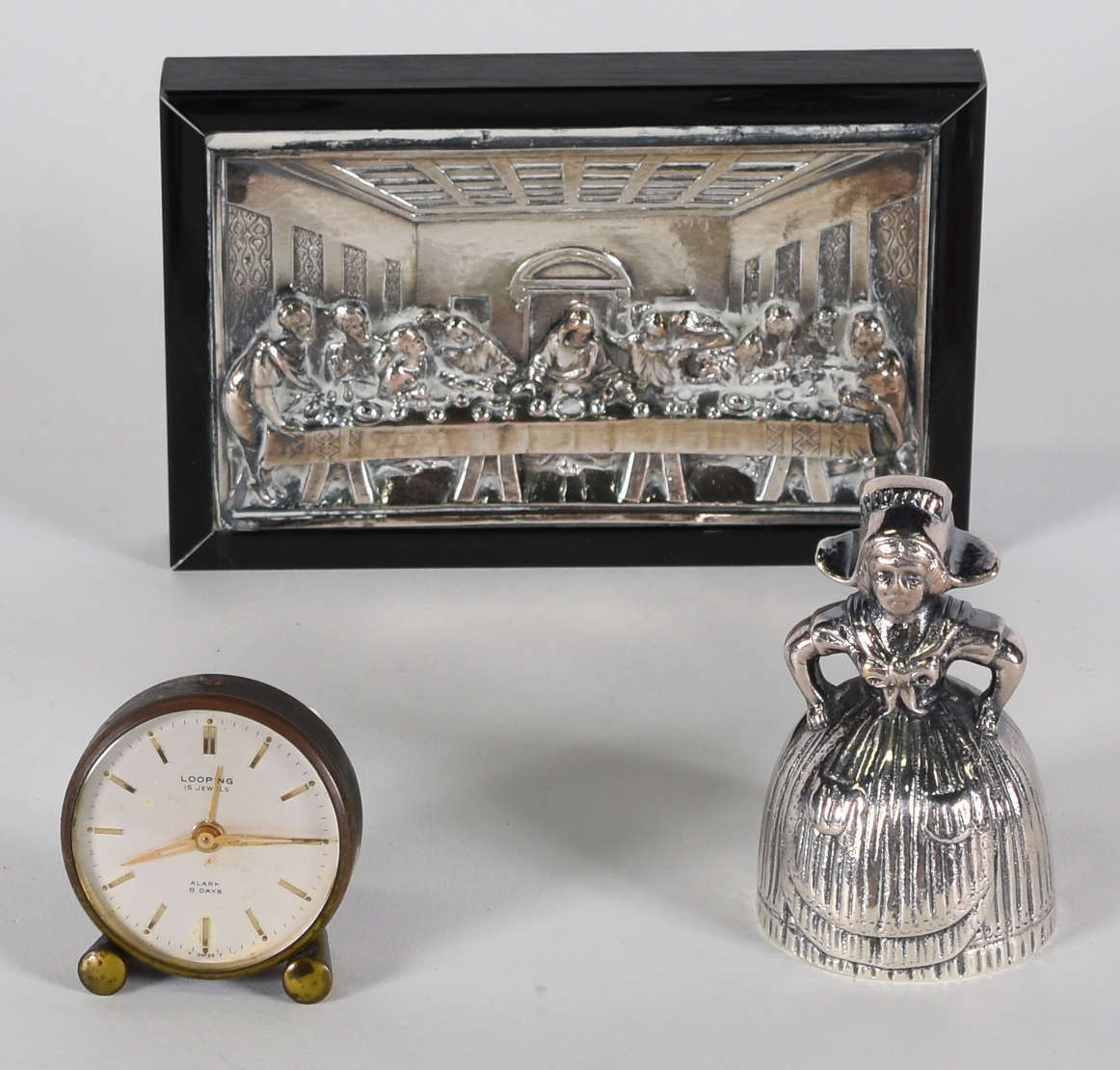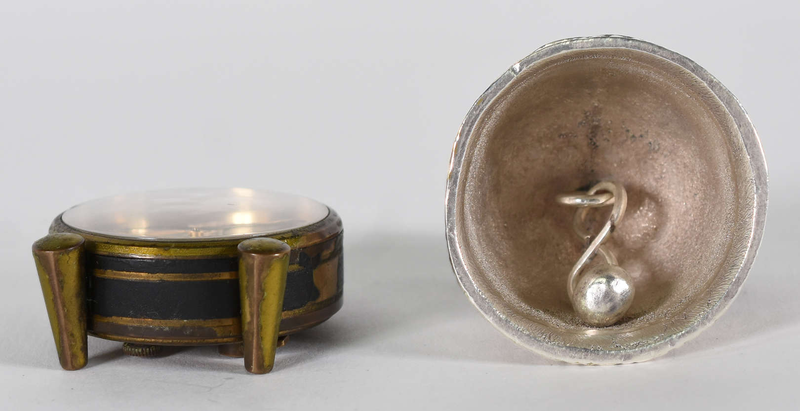 Seis peças de prata diversas, sendo: par de galos contraste 900 mls ; cinzeiro de moedas contraste 800mls; 2 polvil...
