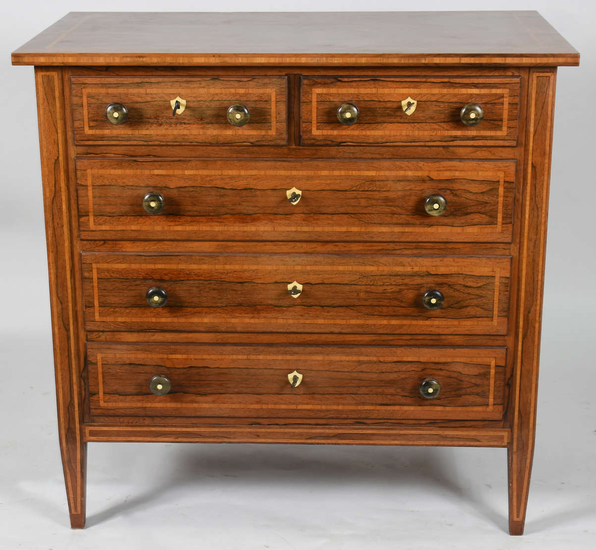 Aparador americano de madeira com 3 gavetas e puxadores de metal, pernas ligeiramente arqueadas.