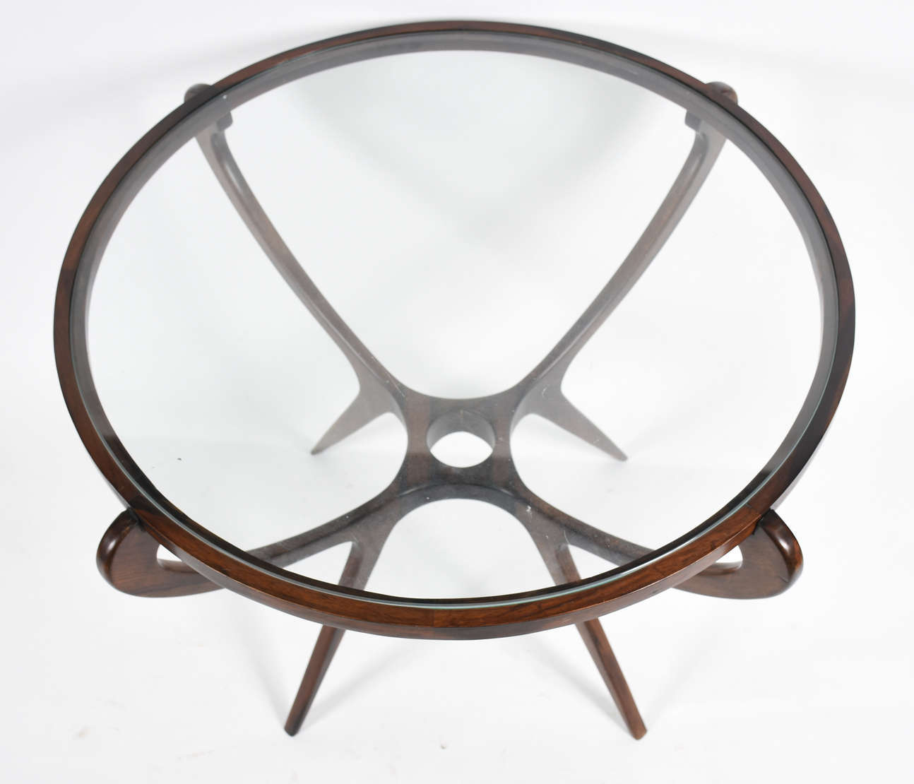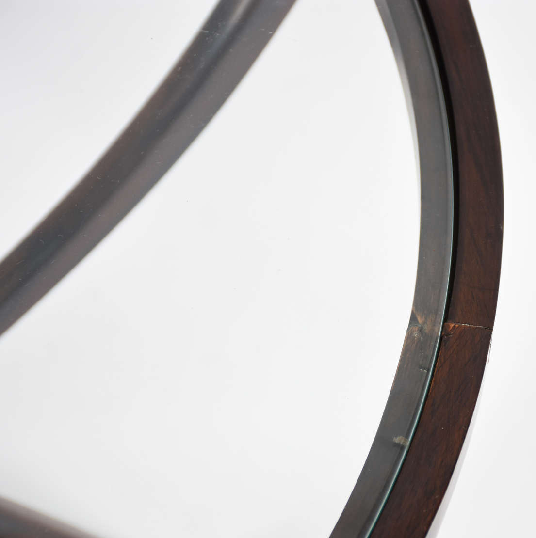 Lote arrematadoLote 4 - Ao vivo! Mesa tilp-top de centro em madeira nobre, feitio oval, pernas torneadas sendo a central articulada para que o tampo t... 44 x 99 x 58 cm