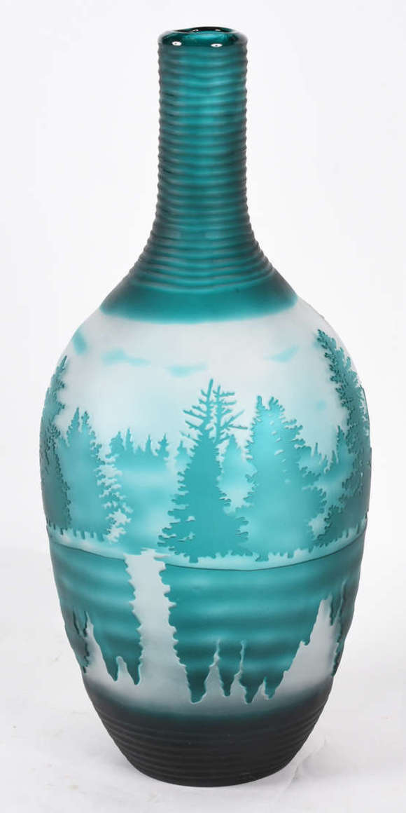 Jarra de vidro decorativo com paisagem em tons de verde.