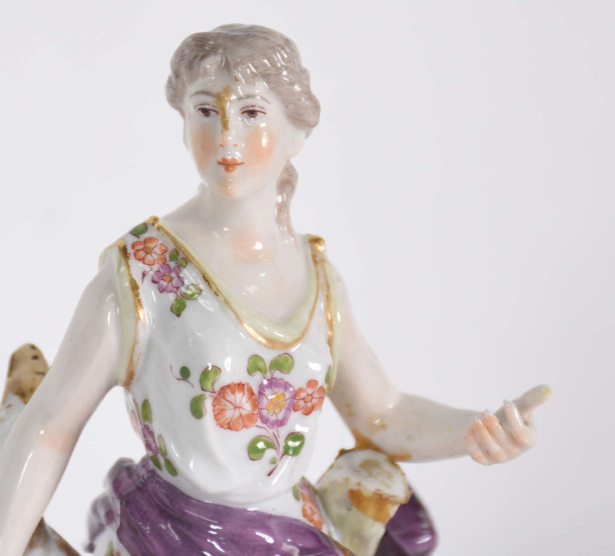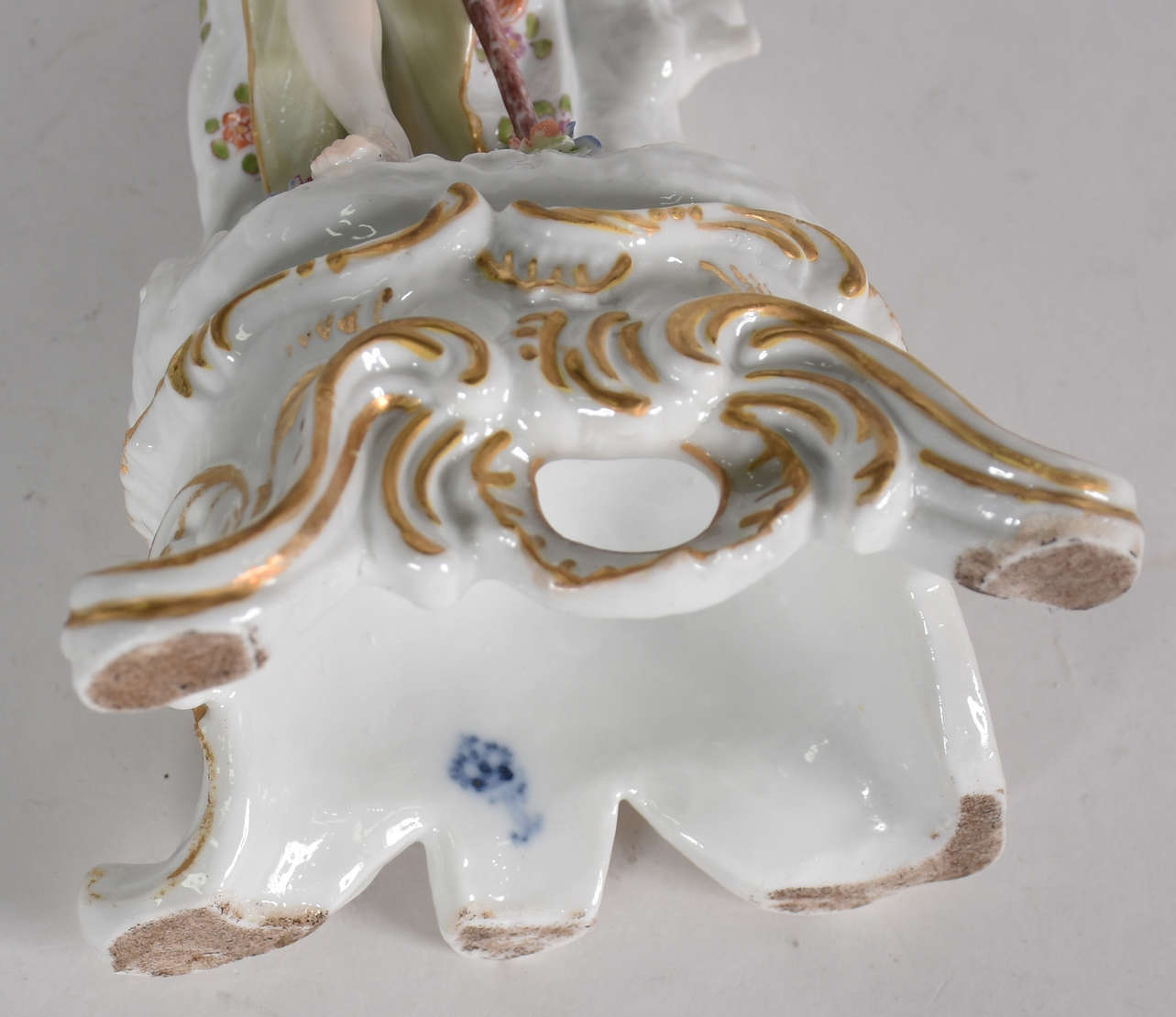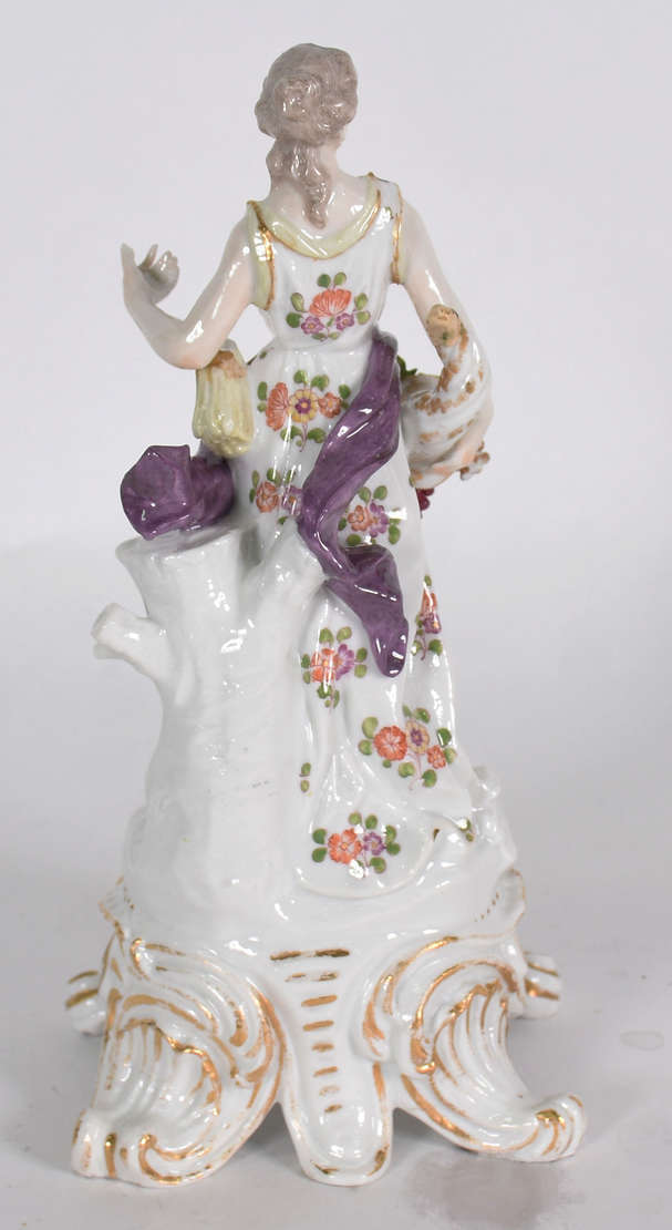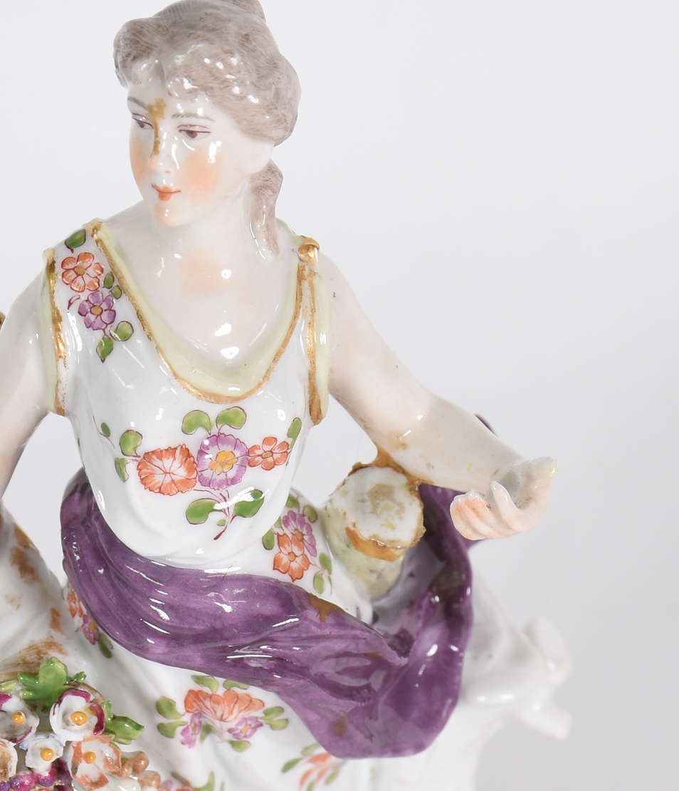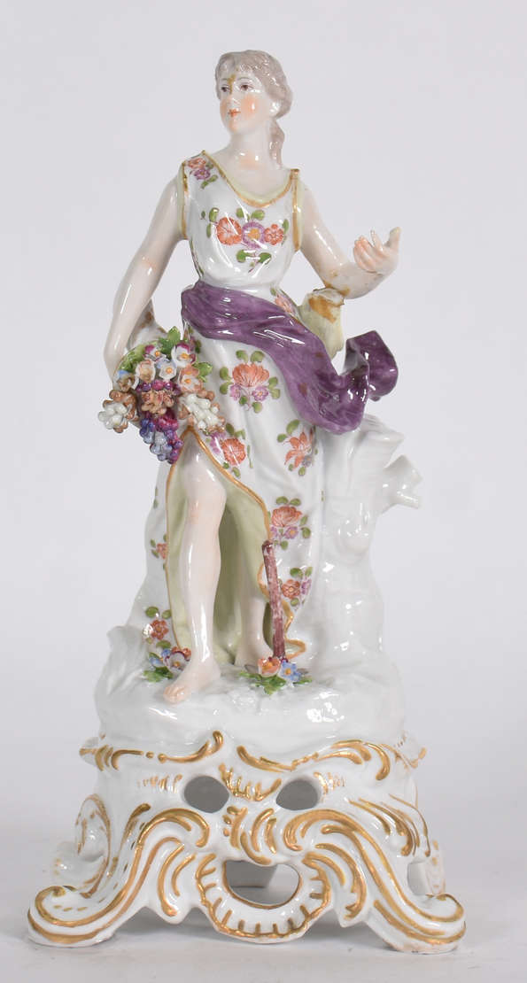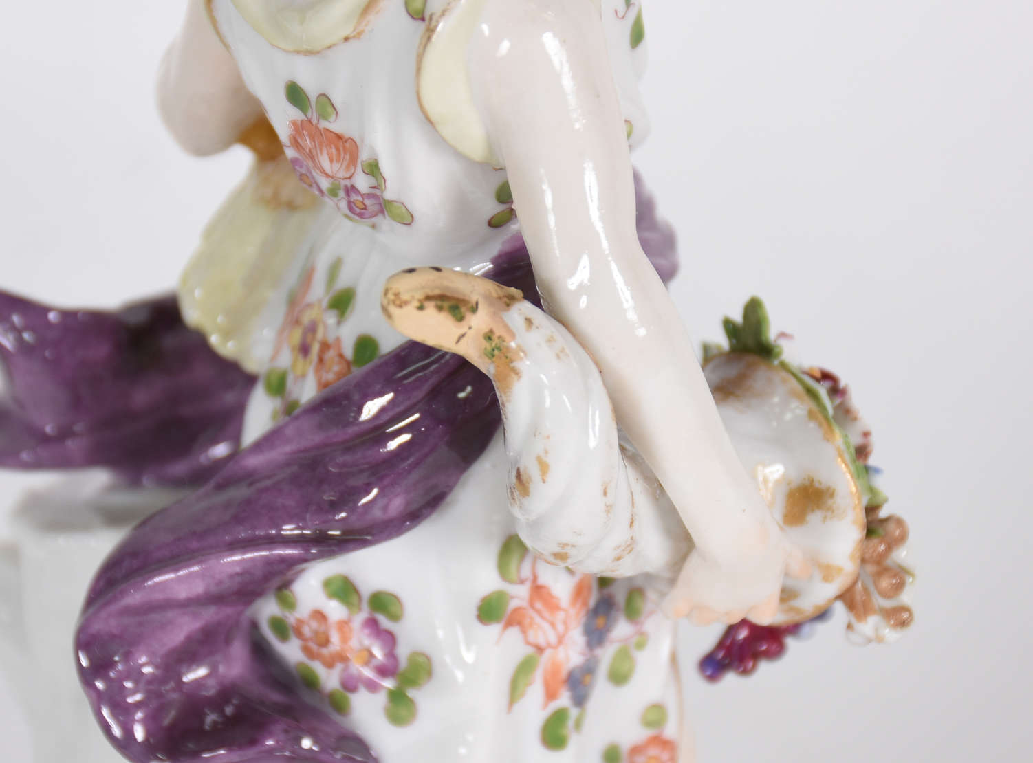 Estatueta de porcelana europeia policromada representando " moça com flores " , realces em dourado ( faltando bouquet na mão esquerda e restauro ). Marca na base.