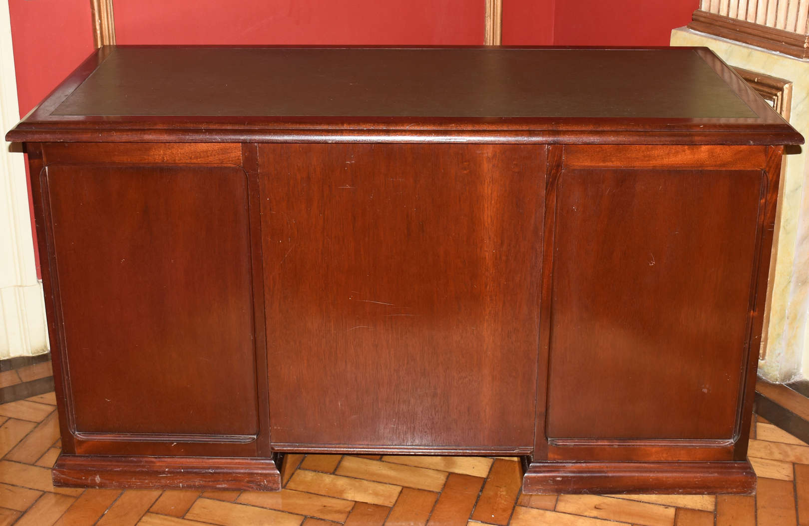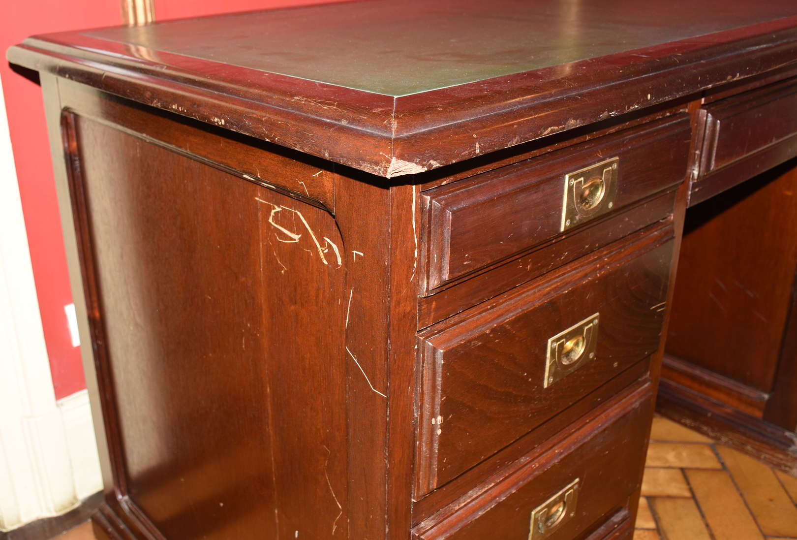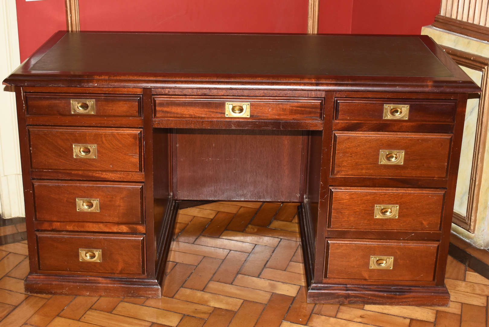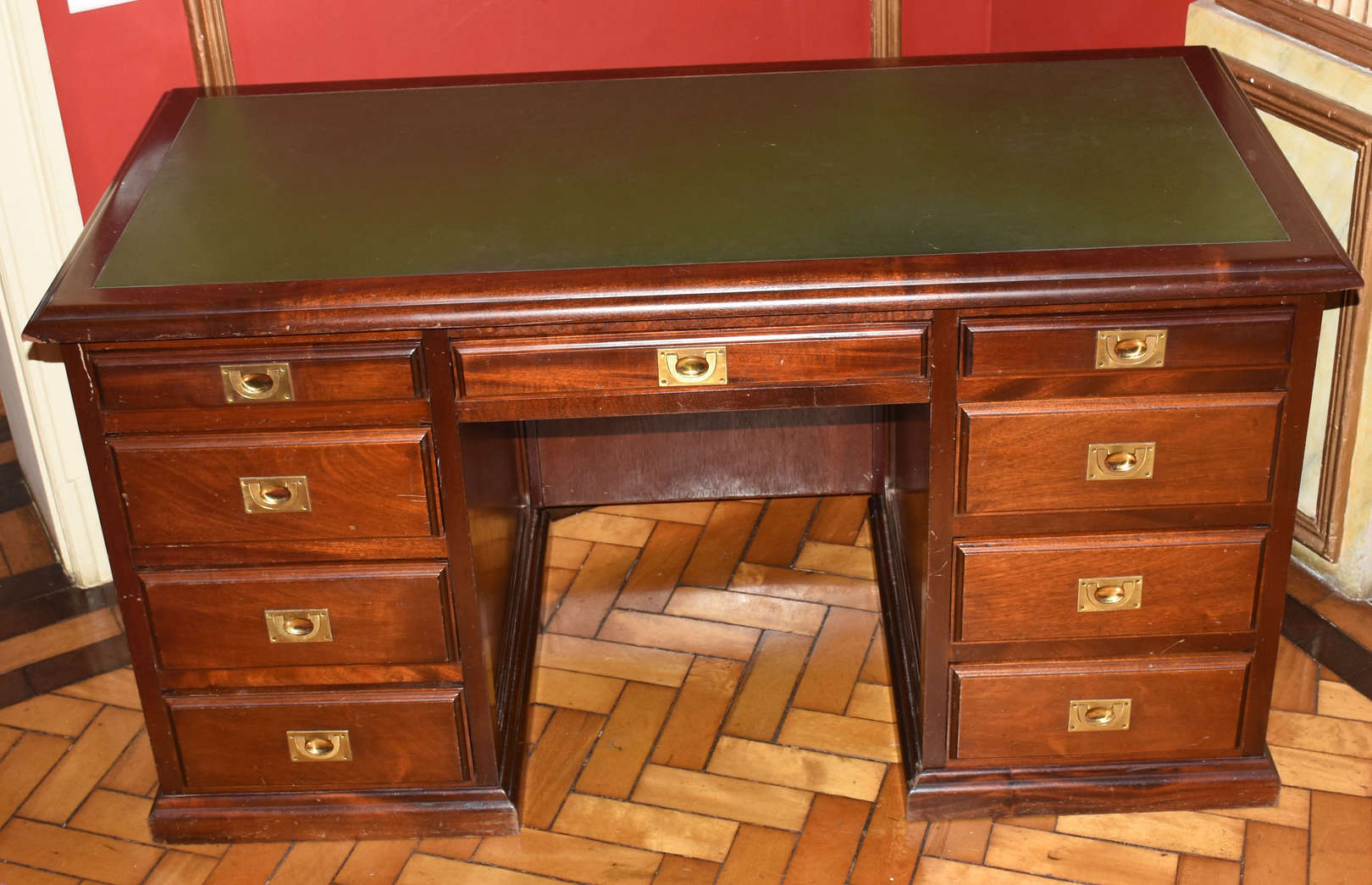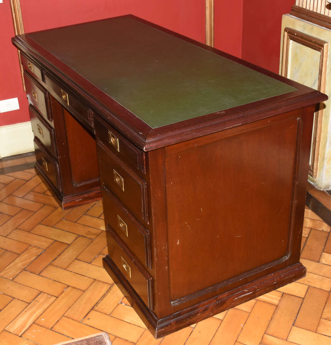 Escrivaninha em madeira nobre estilo ingles, 9 gavetinhas com puxadores de metal dourado embutido, tampo de couro verde 151x81x70cm (CxAxP). Este Lote se encontra no Flamengo. Horário de retirada agendado entre 9h e 15h em dias úteis.