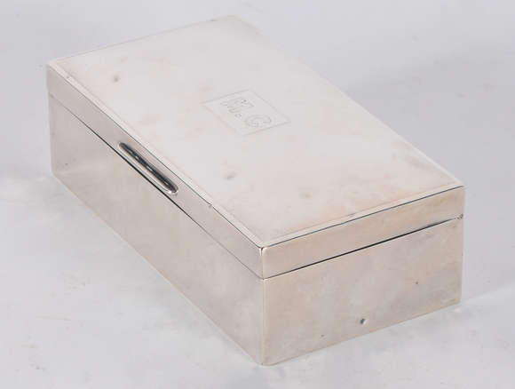 Cigarreira de prata de lei ricamente trabalhada em guilhochados, tampa com as iniciais M.C. Interior de madeira. Pe...