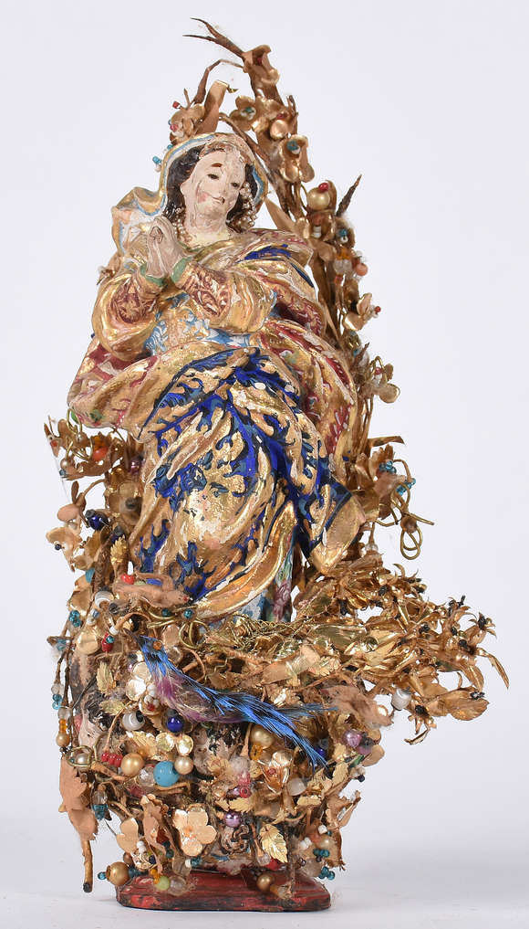 Belíssima Imagem de Nossa Sra.da Conceição de madeira policromada, guarnecida com pequenas conchas e enfeites dourado...