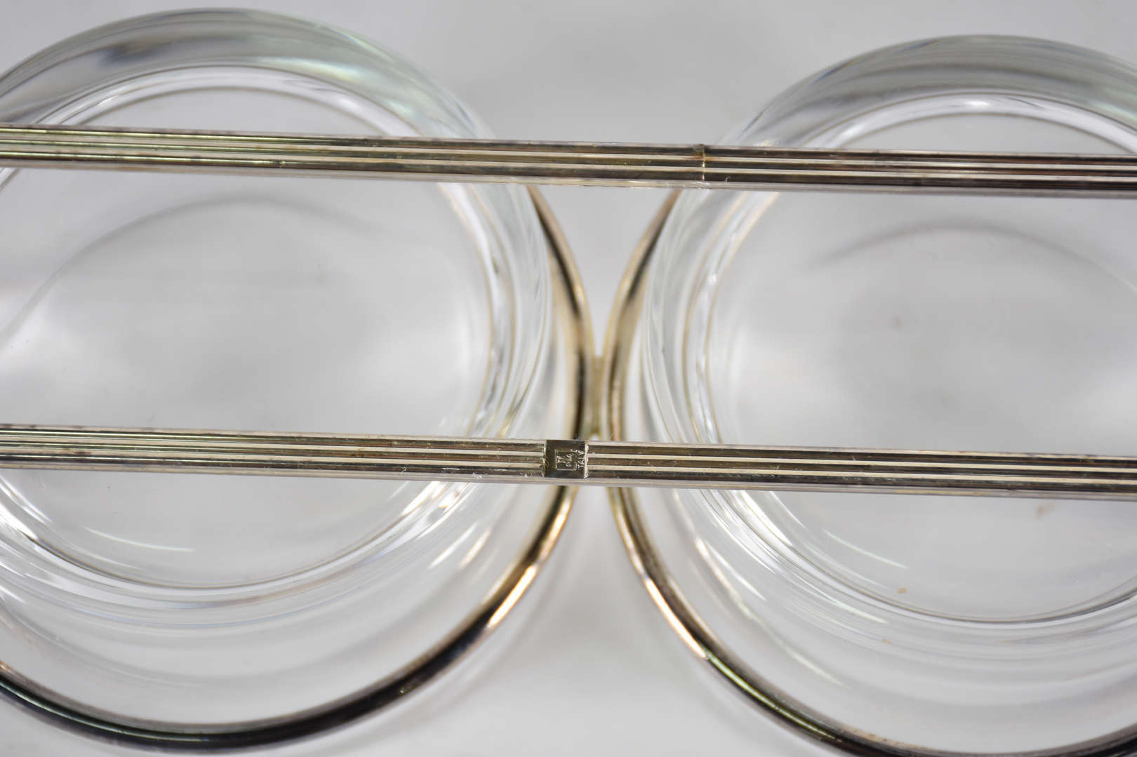 Duas peças de metal prateado, sendo: pota salgados com 3 recipientes de vidro e, concha porta caviar com recipiente ...