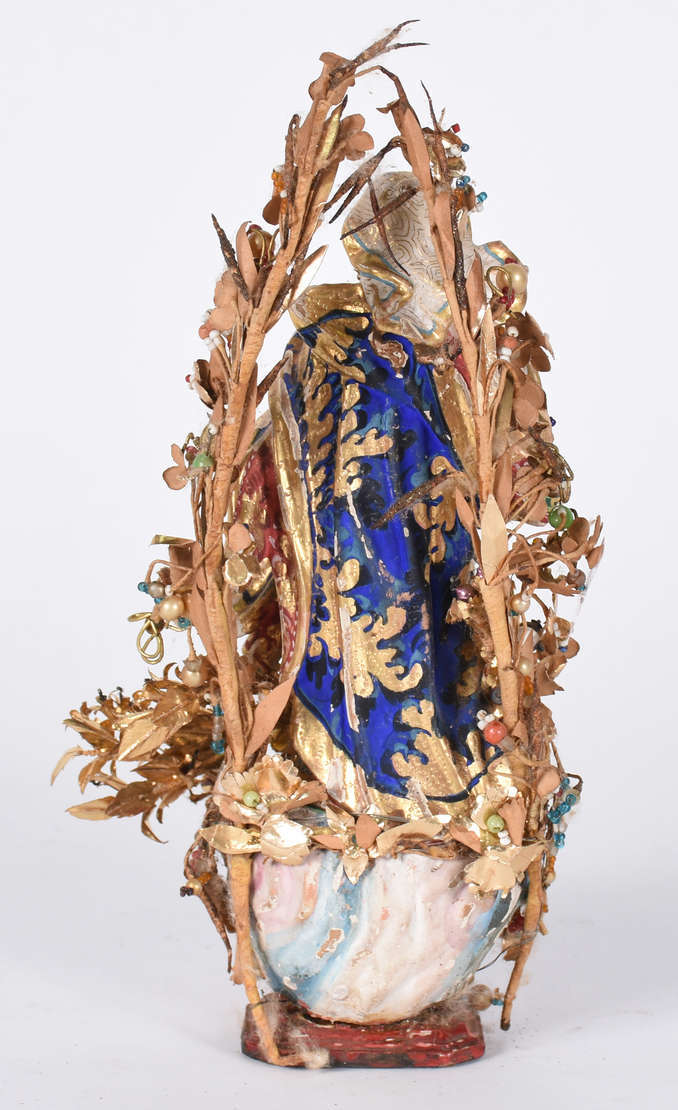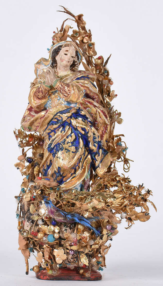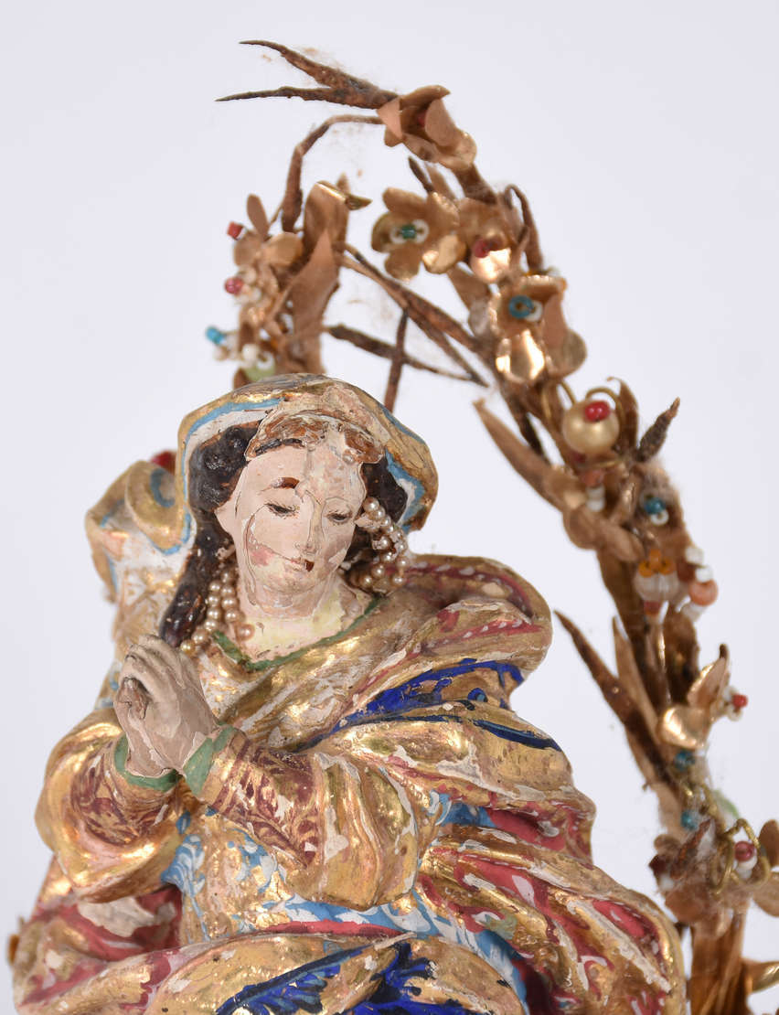 Imagem baiana representando Santa com menino, de madeira policromada e dourada.