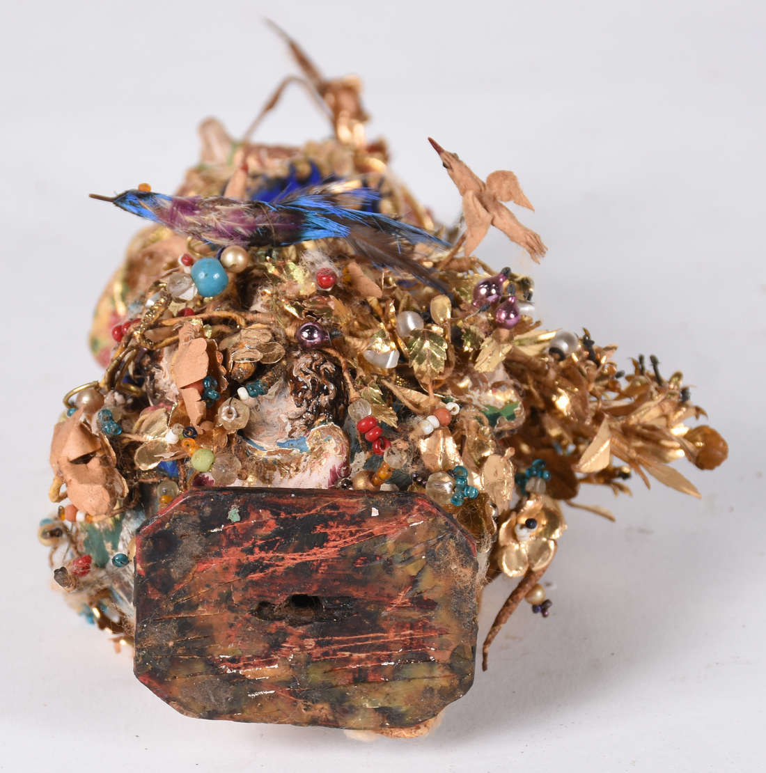 Menino Deus de madeira entalhada e policromada sobre base dourada, olhos azuis de vidro, pequeno colar perolado e co...