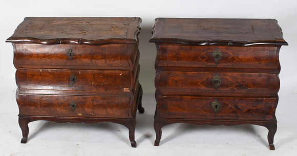 Par de mini cômodas estilo holandes, tres gavetas cada, tampo recortado e gavetas arredondadas (precisa restauro).