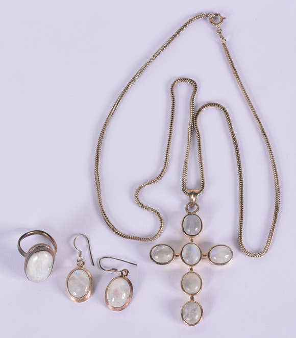 Cordão com pendente em cruz , anel e par de brincos de prata com pedras opalescentes . Aro 16. altura total fecha...
