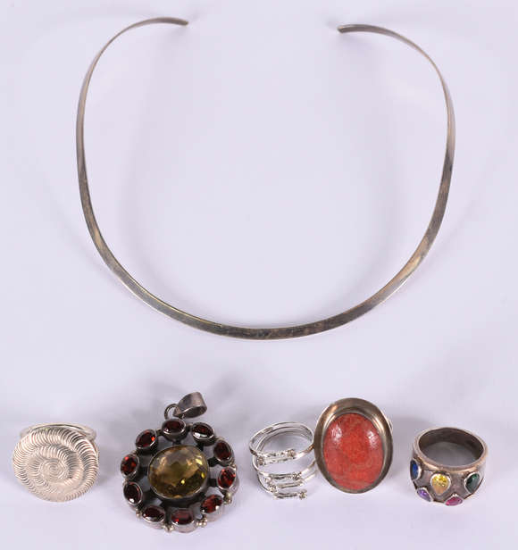 Seis peças de prata sendo : Gargantilha , 4 anéis e 1 pendente . Aros 16/17/18 e 19 ( por questão de segurança a ...