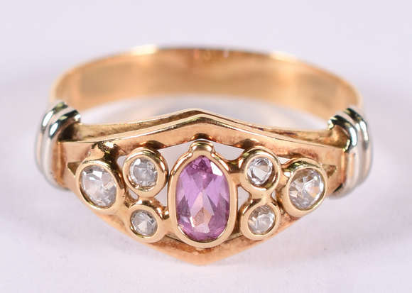 Anel de ouro 18 k com brilhante e turmalina rosa. Aro 15 (Por questão de segurança a peça não se encontra na loja)