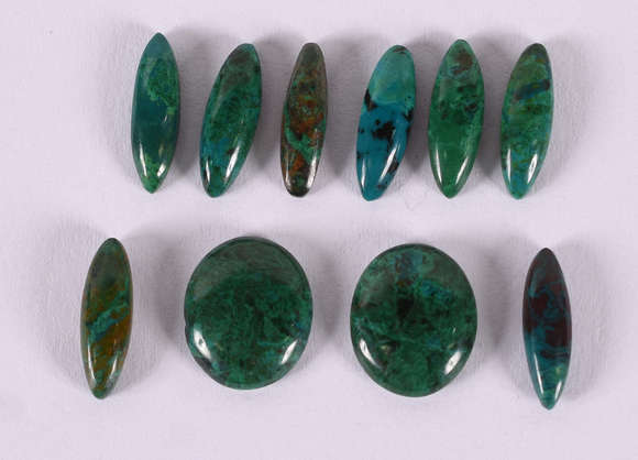 Dez pedras Malaquita sendo 8 navetes e 2 redondas. Total 15,5cts (por questão de segurança a peça não se encontra n...