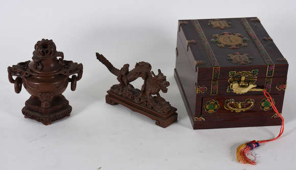 Tres peças orientais, sendo: Caixa porta jóias com espelho interno articulado; incensório e dragão de material sinté...