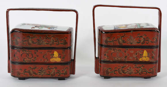 Par de marmitas orientais de laca com tampa de porcelana (1 tampa no estado)