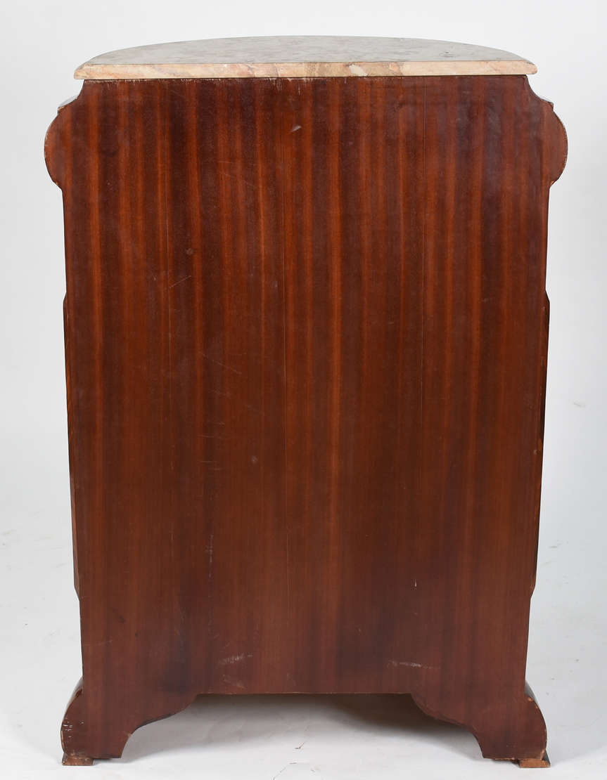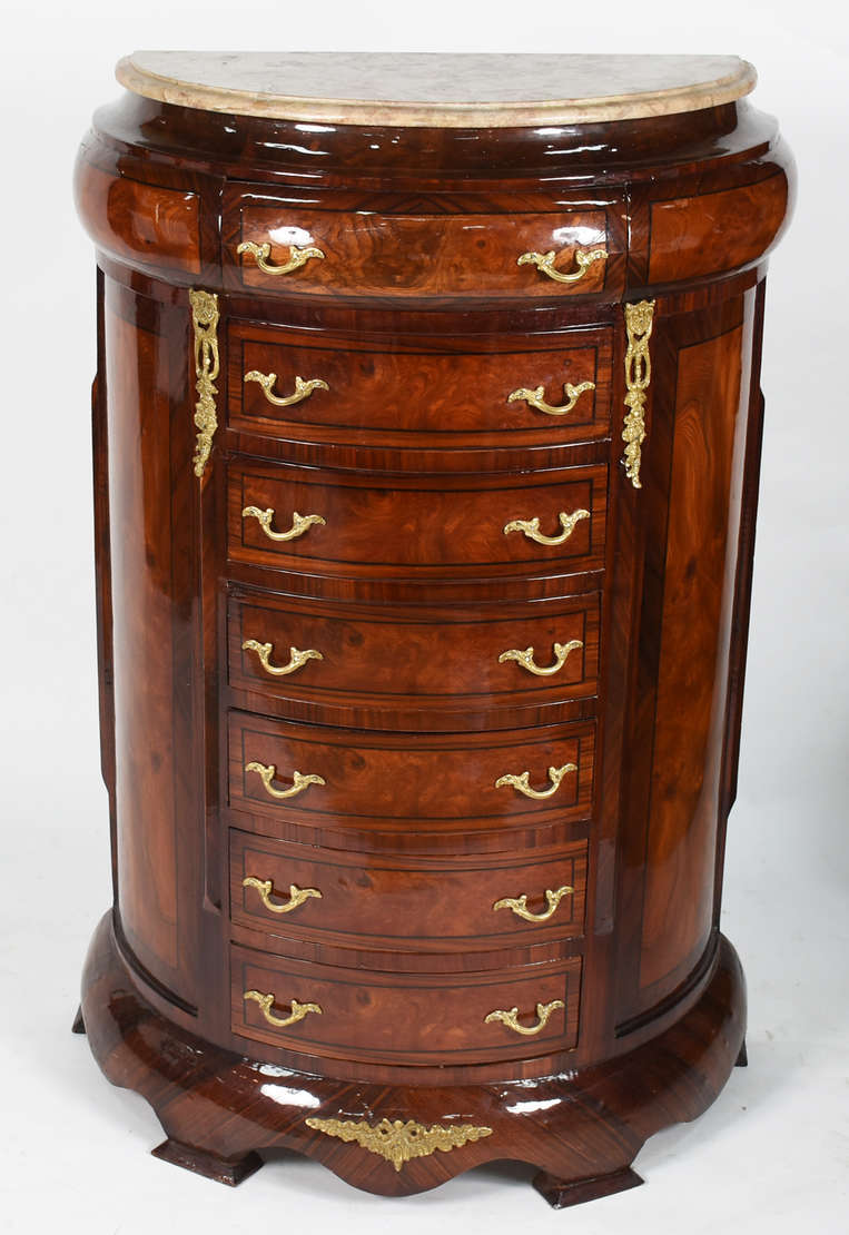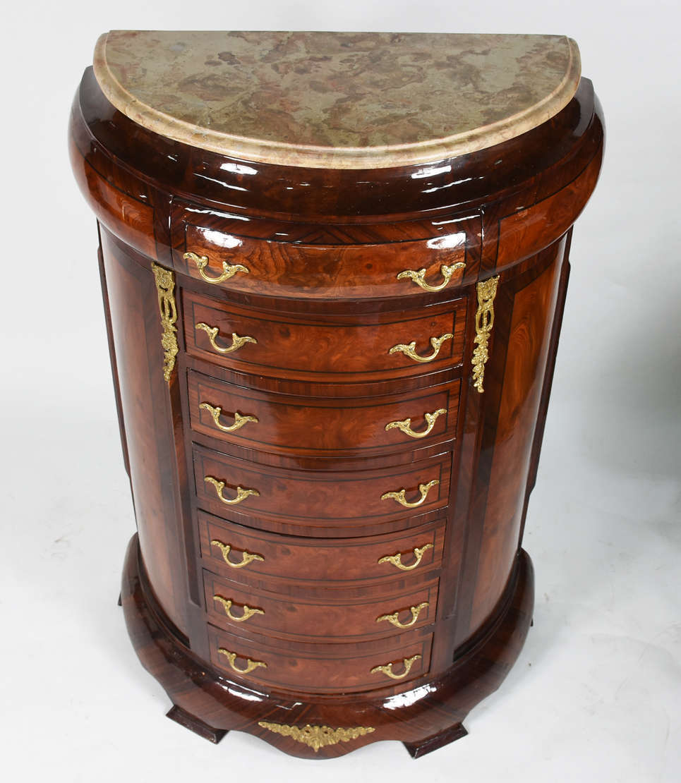 Mesa redonda estilo Francês com aplicações em bronze , tampo de mármore.