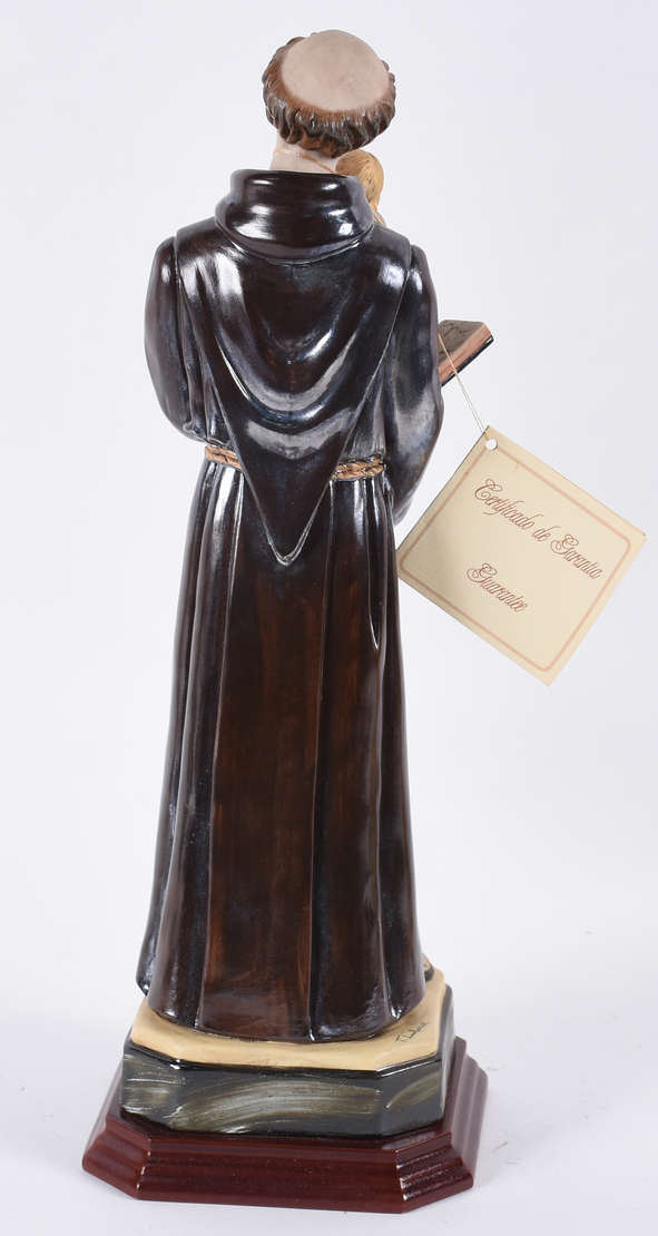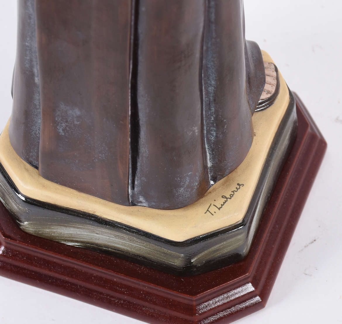 Escultura de resina representando figura feminina e coluna de madeira com 2 platôs.