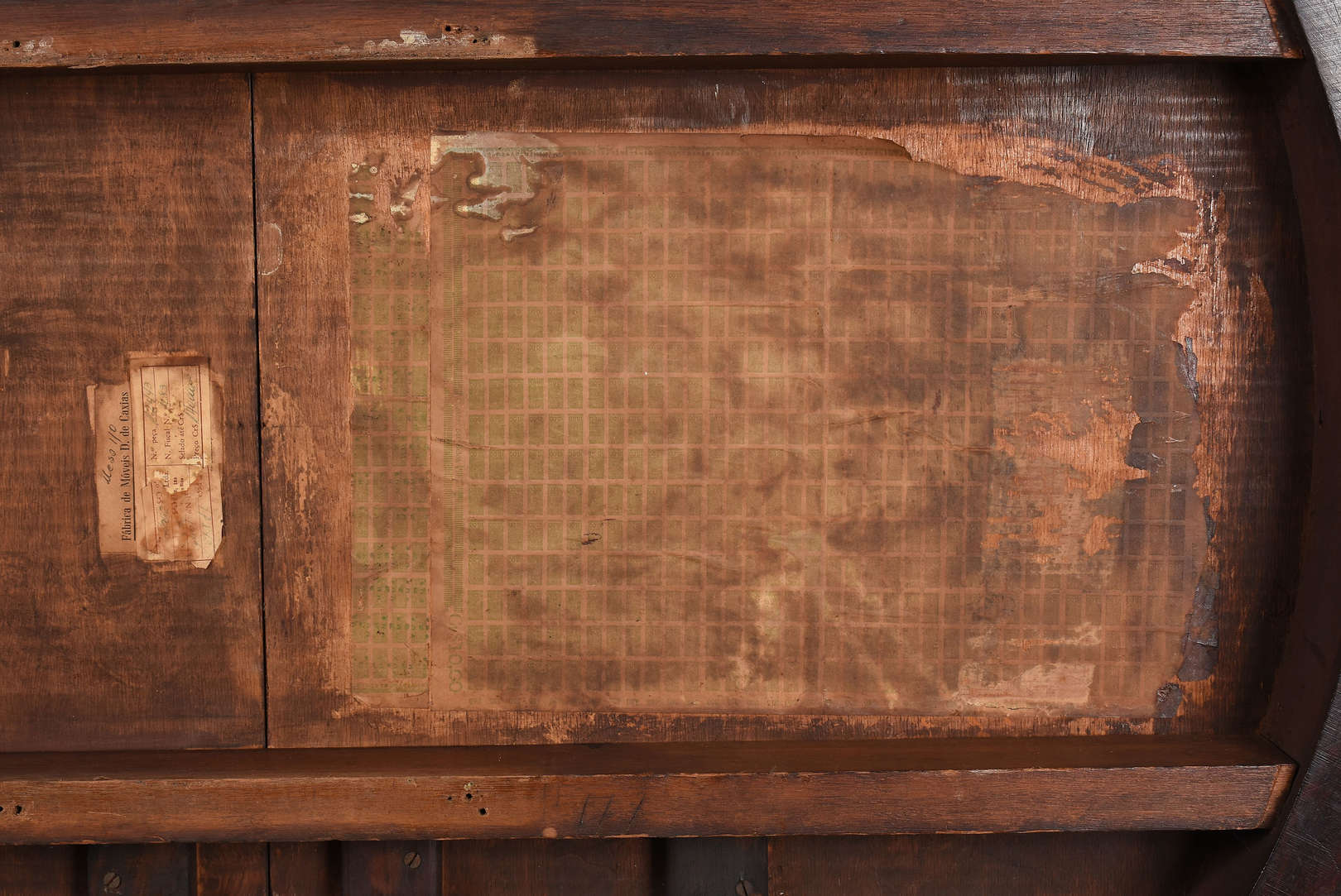 Móvel escrivaninha de madeira nobre com tampo redondo articulado, forração interna com tecido azul (desgastado), tre...