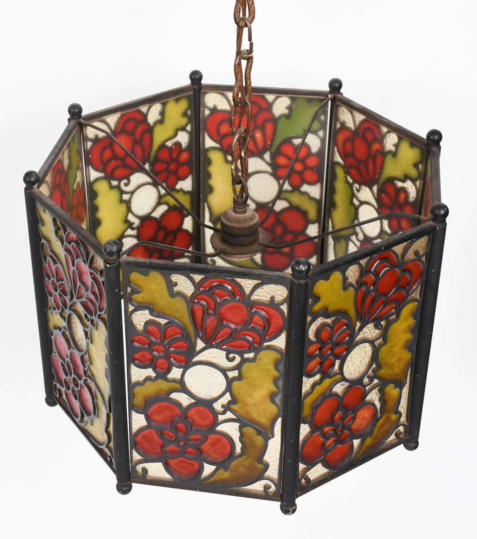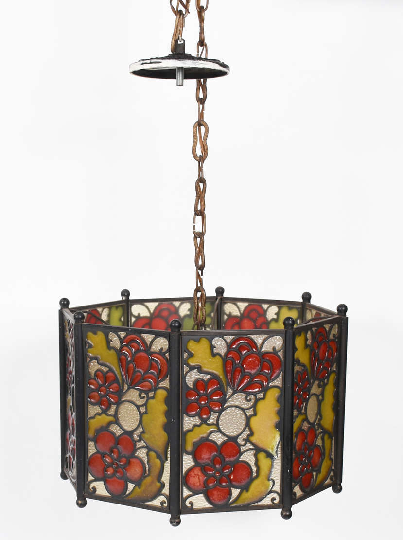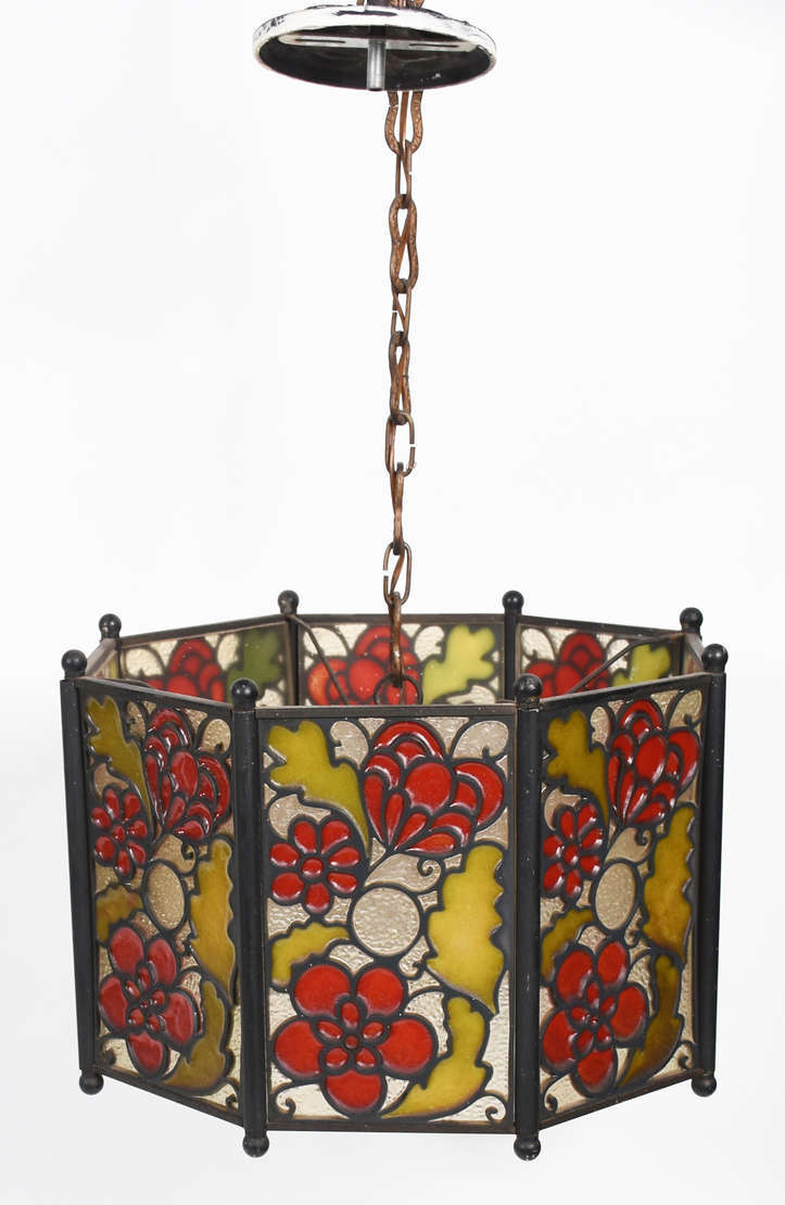 Luminária de metal ao gosto Tiffanys, cúpula trabalhada em vazados com fundo de vidro caramelo.