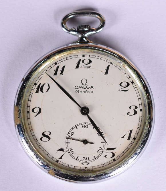 Relógio suíço de bolso , marca Omega (metal com desgastes). Funcionando.