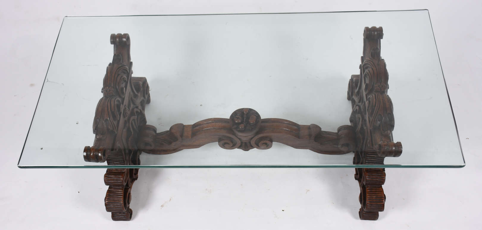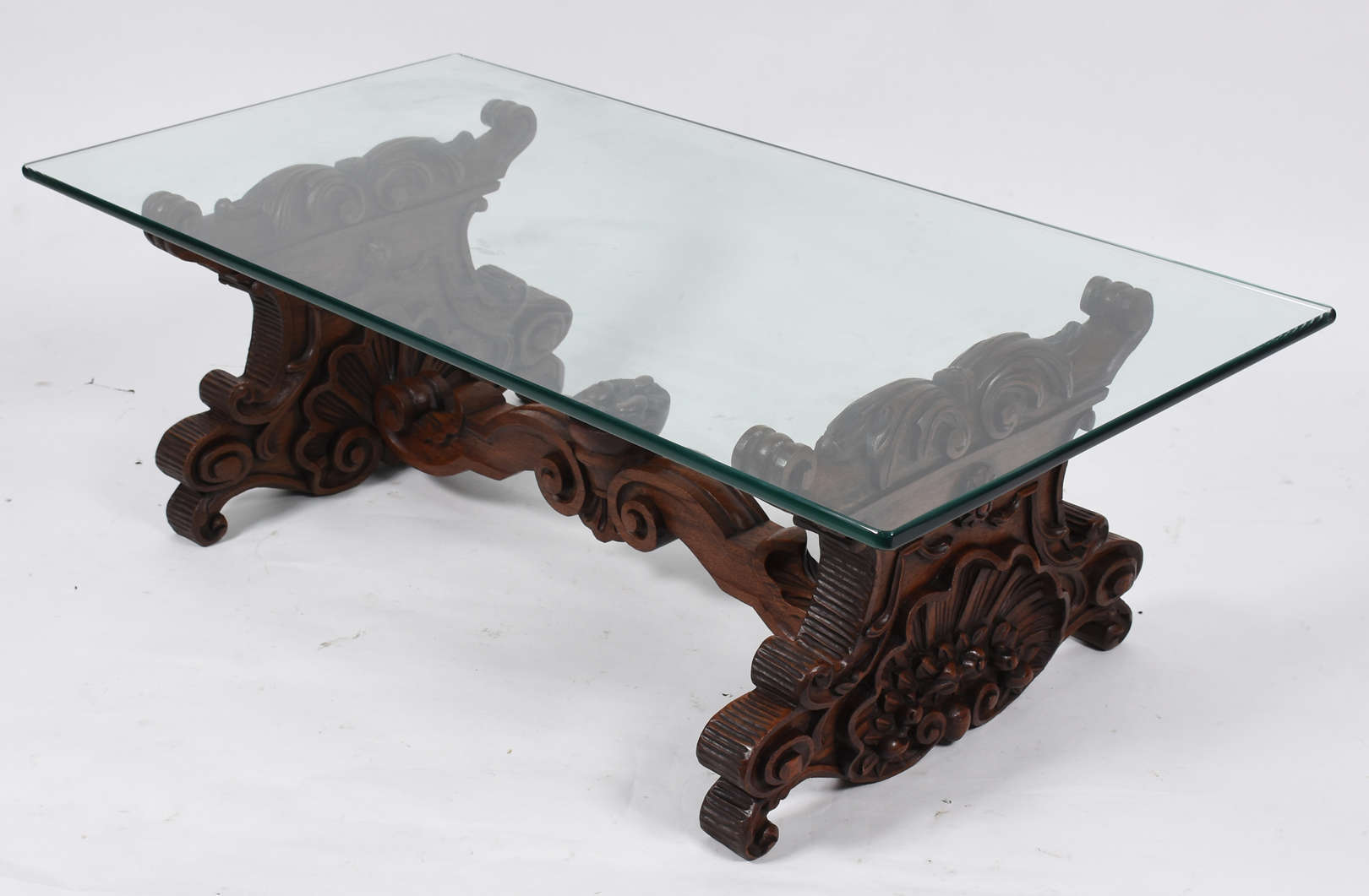 Mesa de centro de madeira nobre, pernas cilíndricas torneadas, tampo de mármore. Retirada em Niterói.