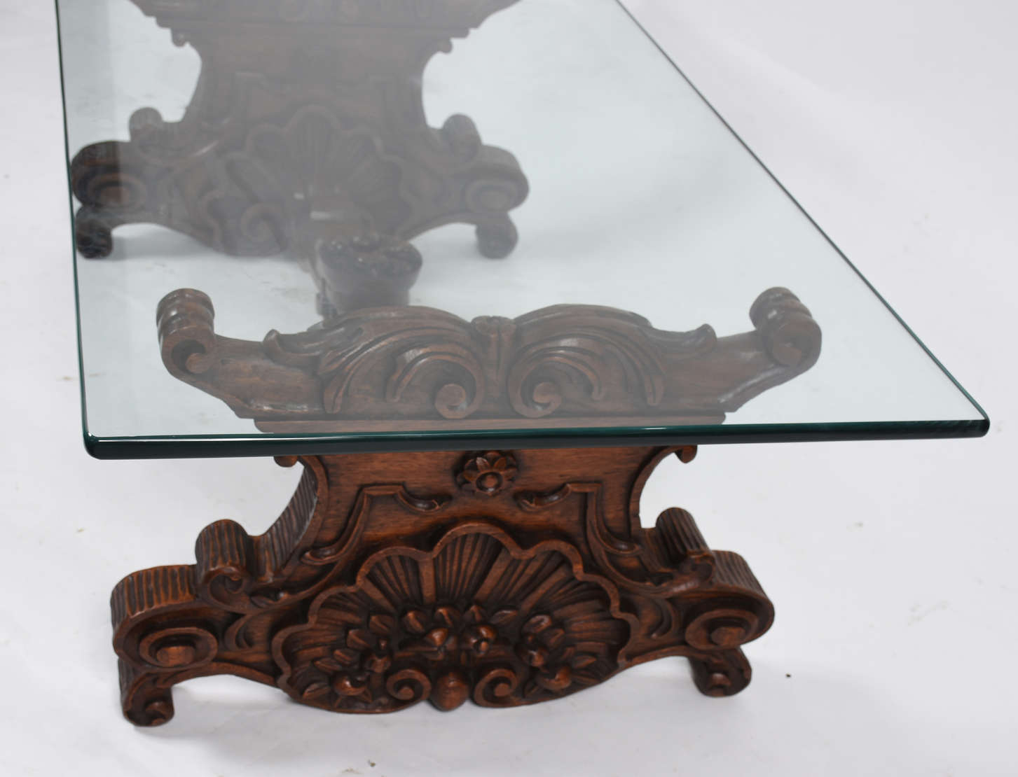 Console de madeira nobre com saia vazada e pernas ligeiramente arqueadas com entalhes florais, tampo de mármore, acom...