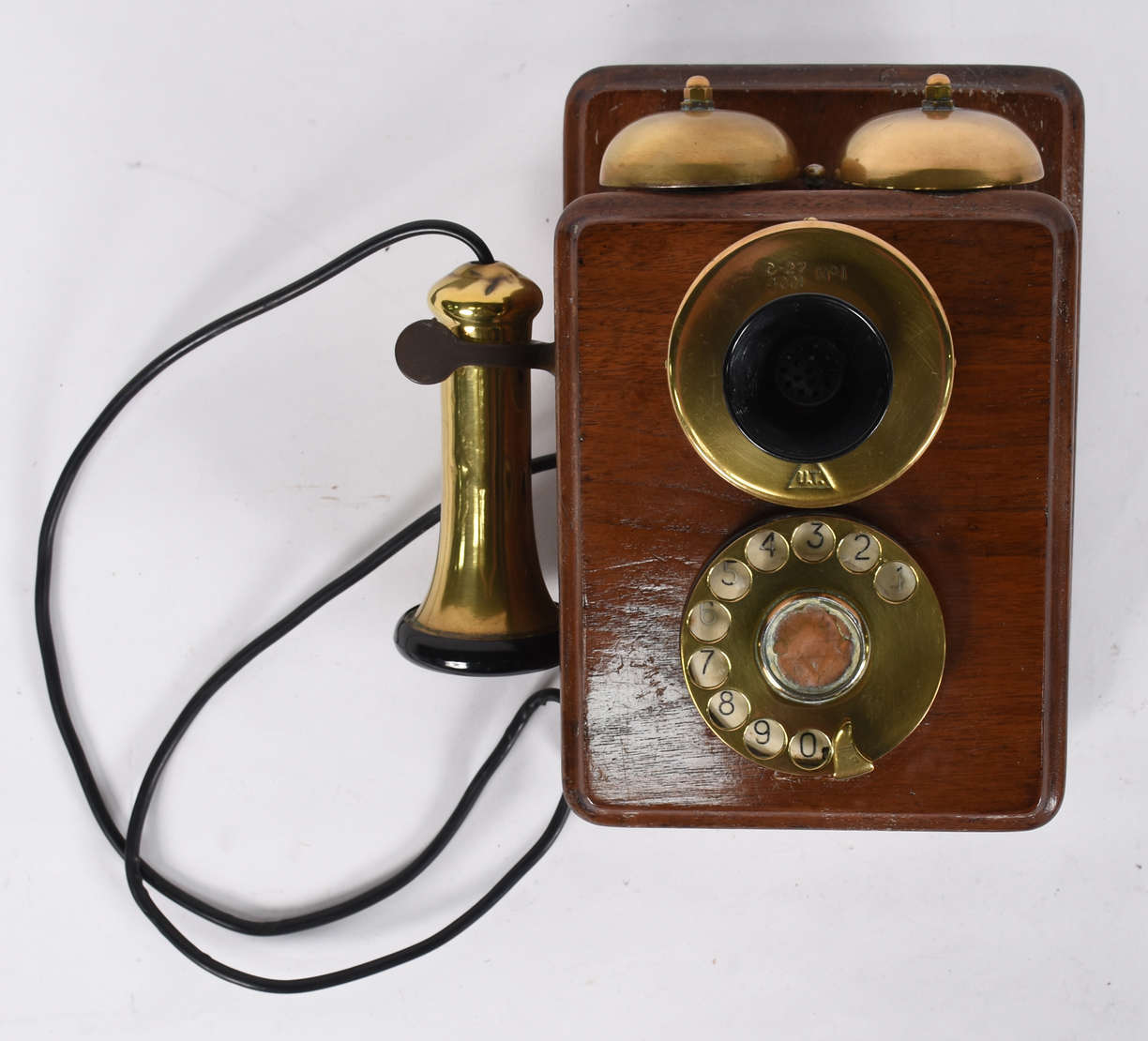 Pequeno relogio de parede, mostrador de porcelana com rachado, caixa de madeira trabalhada.