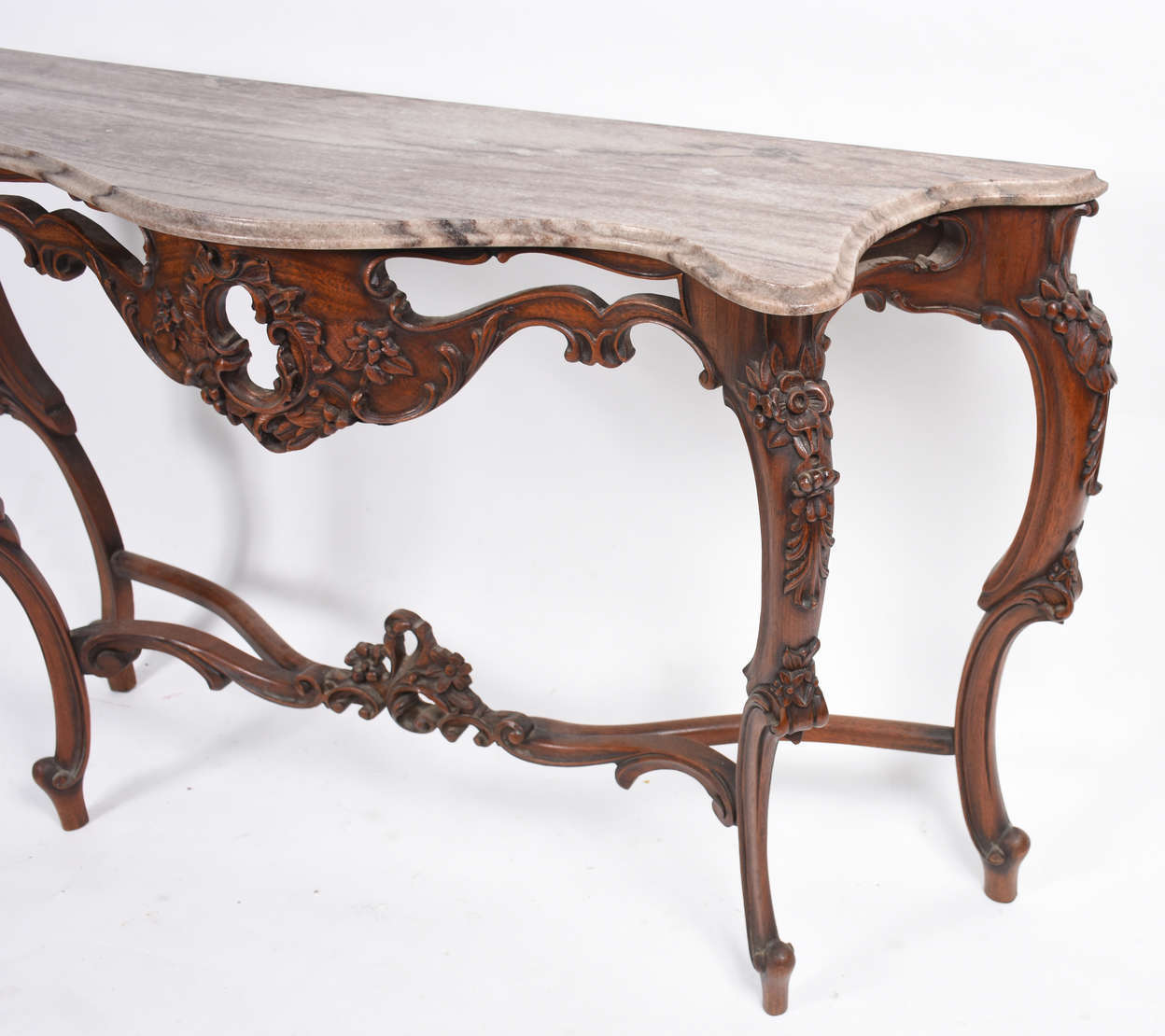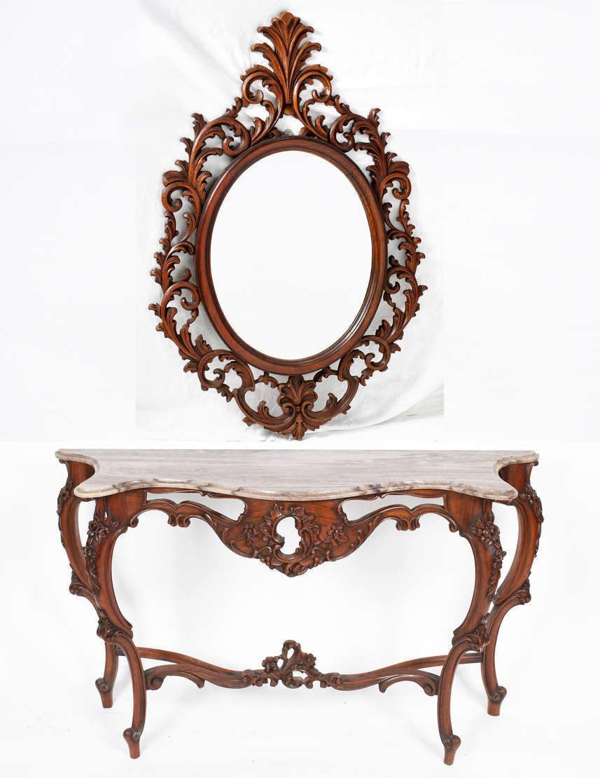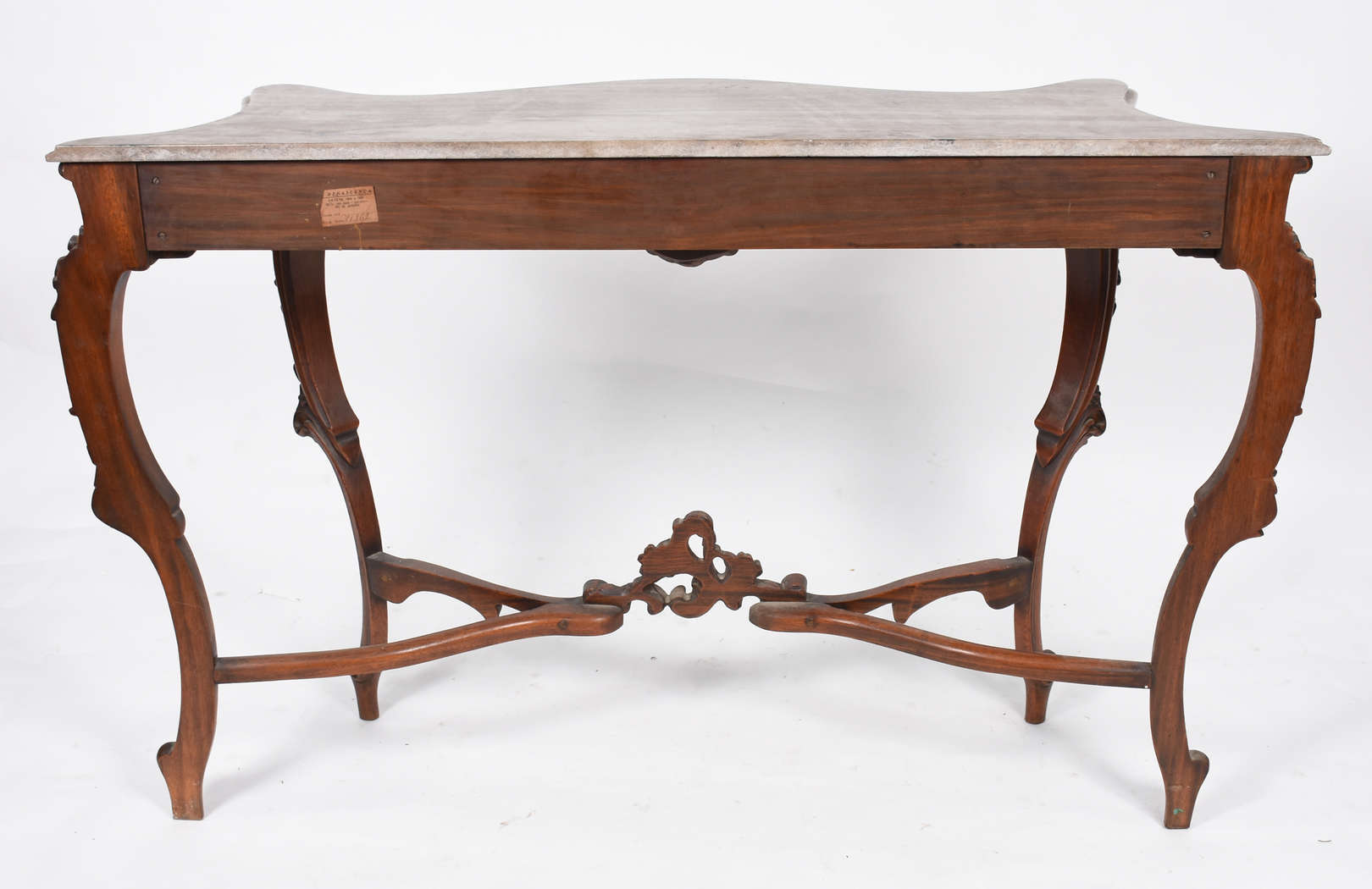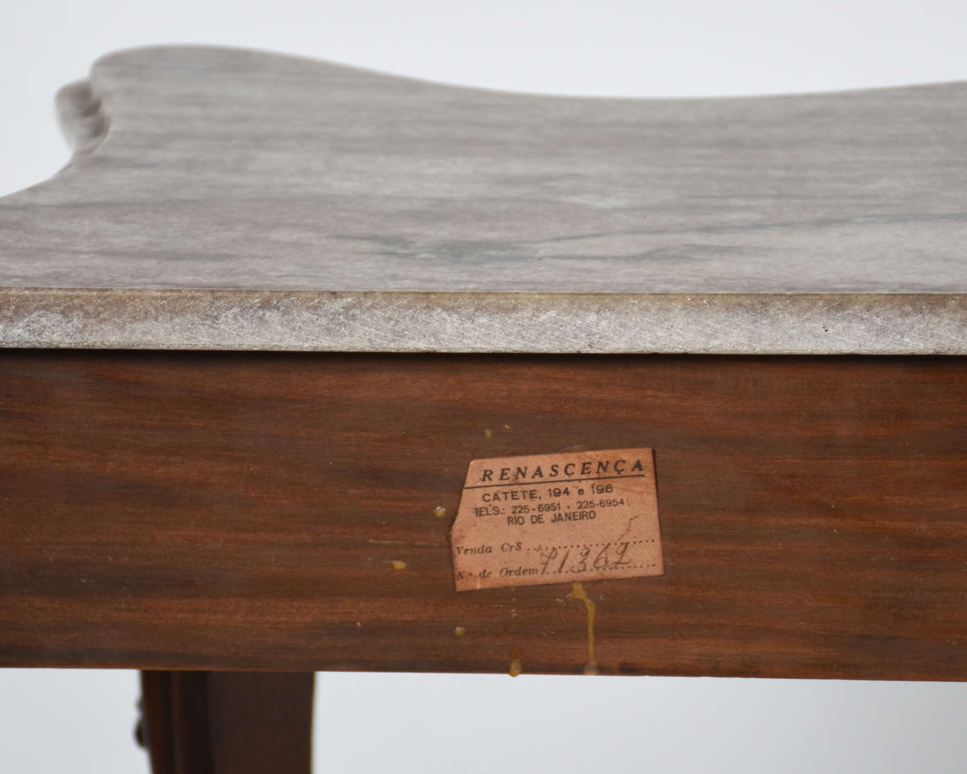 Mesa de centro de madeira nobre, pernas cilíndricas torneadas, tampo de mármore. Retirada em Niterói.
