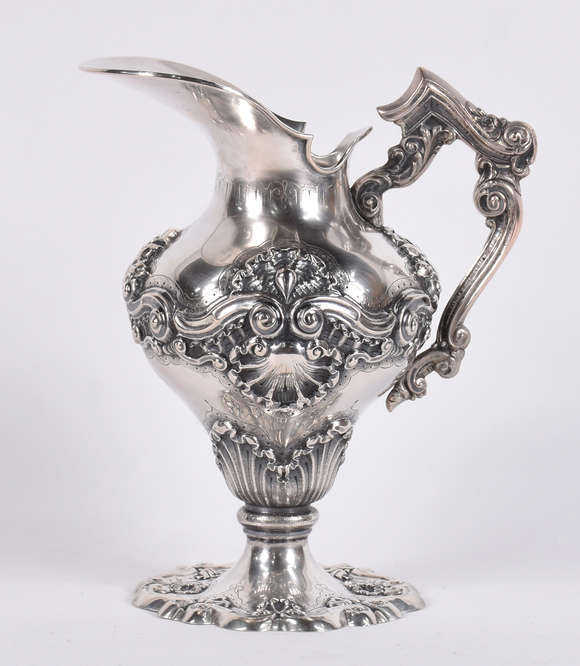 Jarra de prata de lei contrastada, concheados e folhas em relevo.