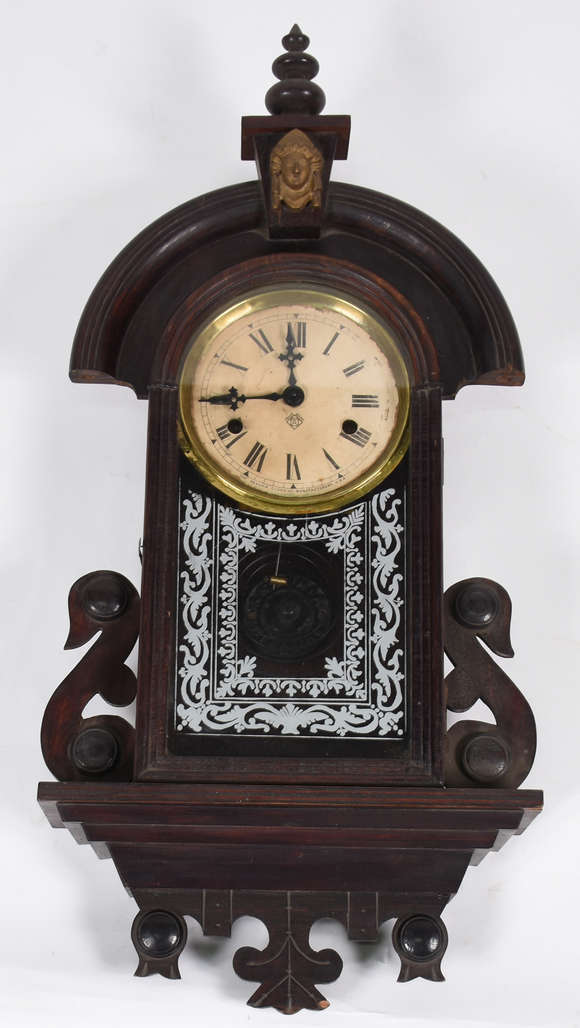 Relógio de parede da marca americana ANSONIA, caixa de madeira feitio "Capelinha" ( funcionando mas falta o pêndulo).