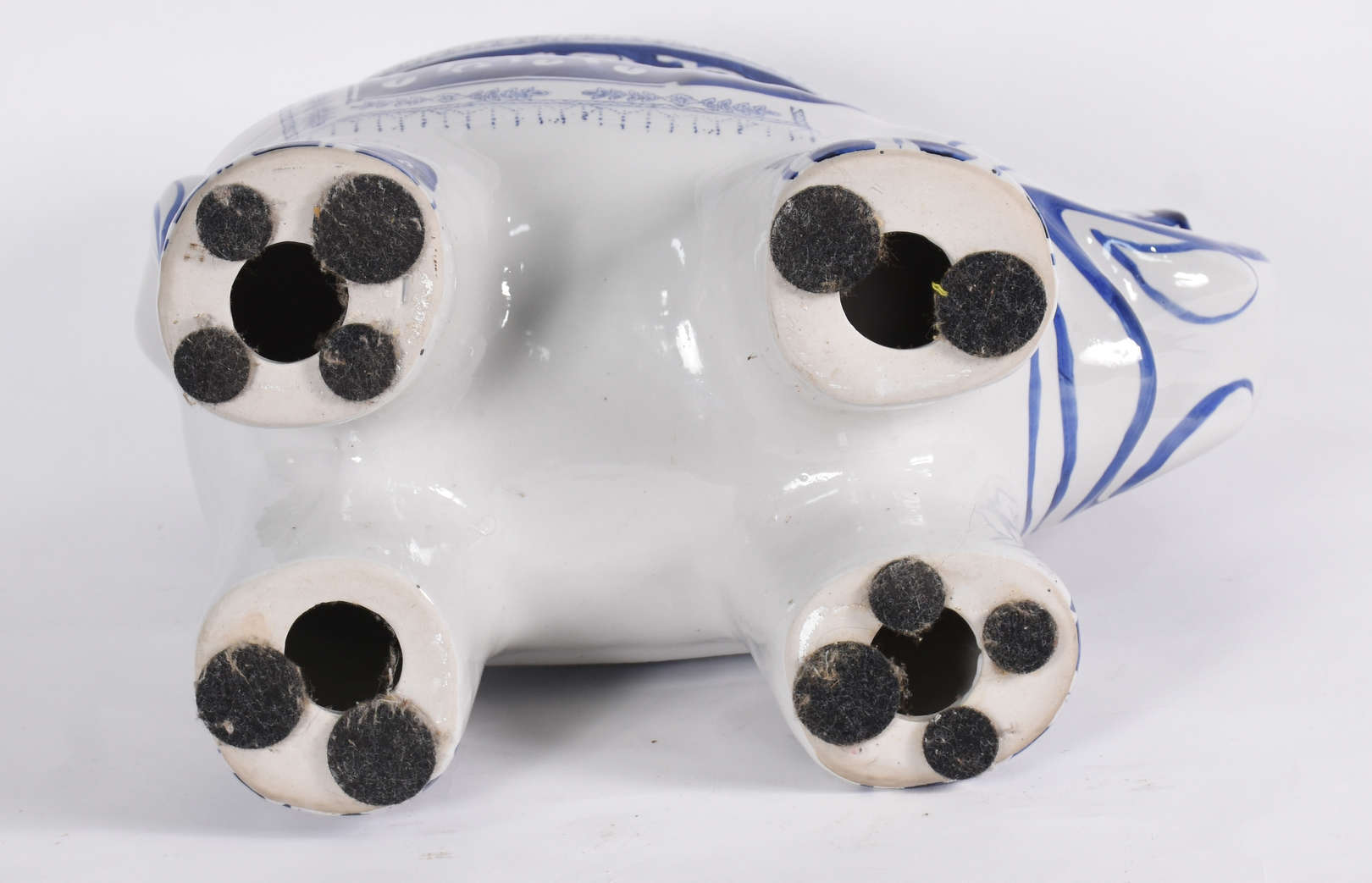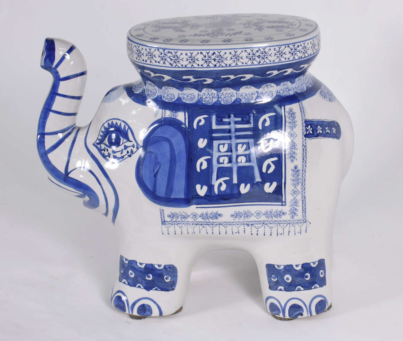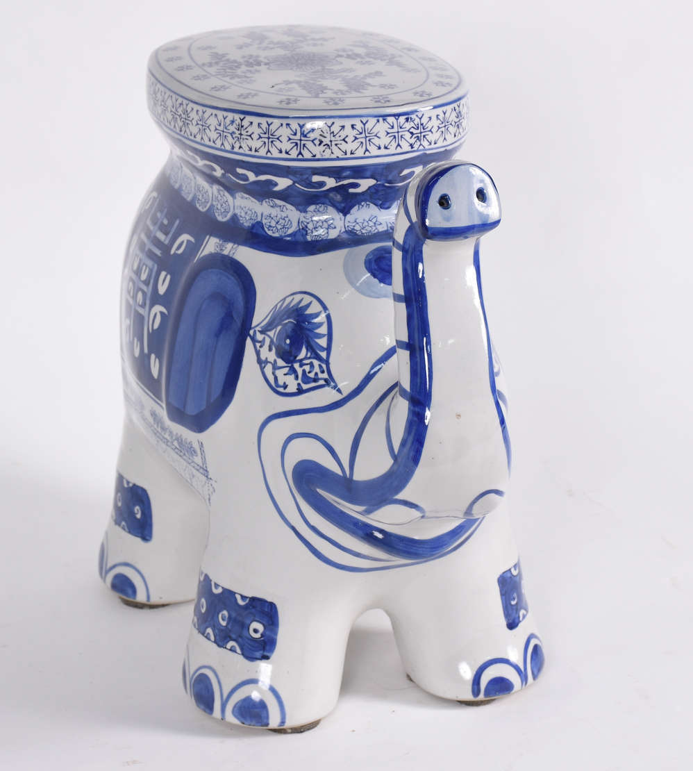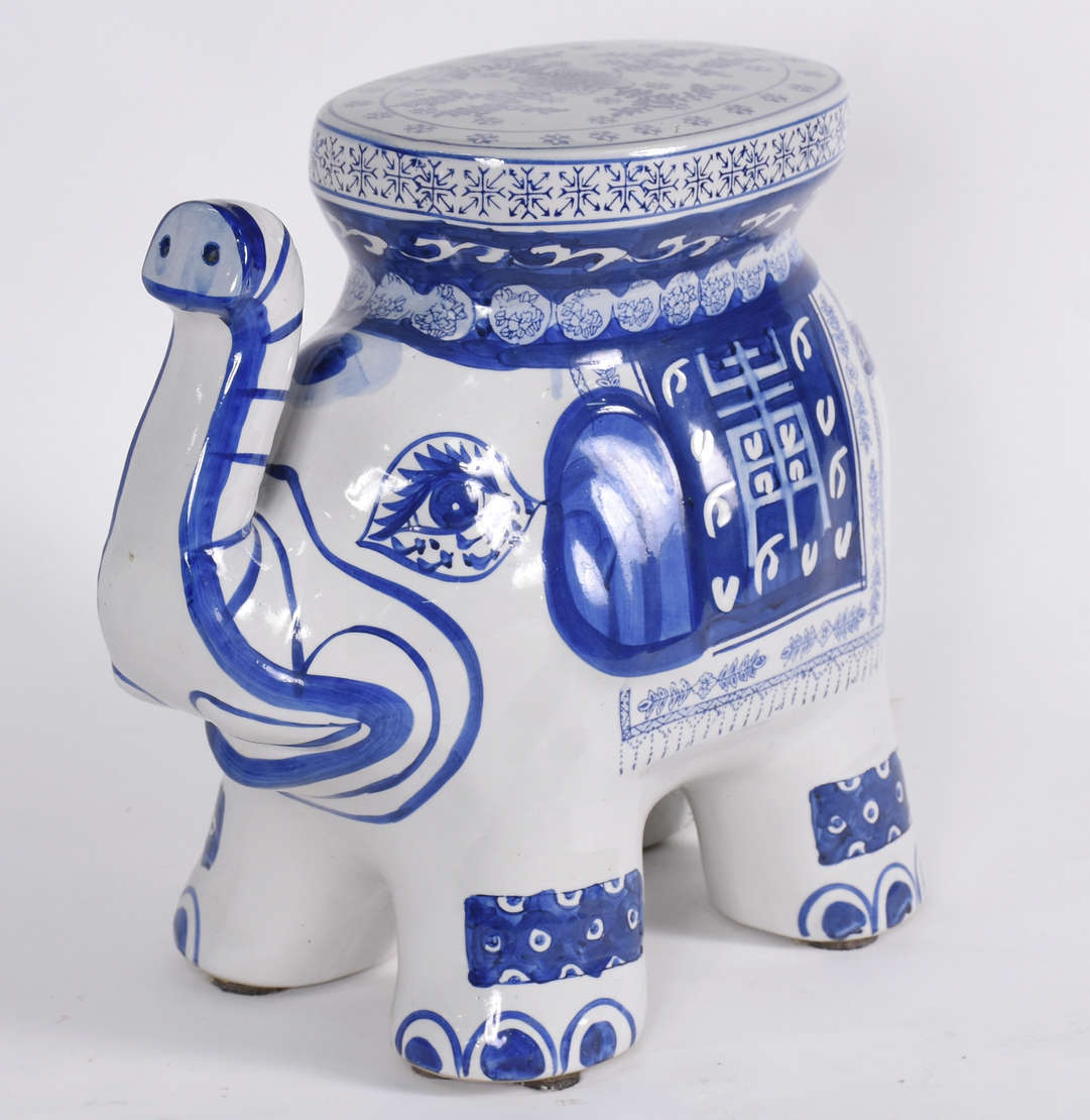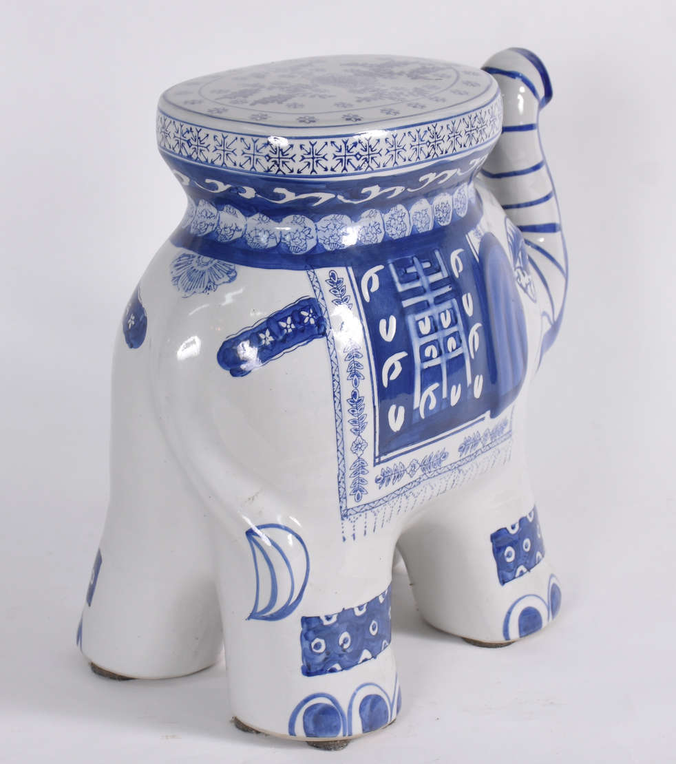 Grande elefante de porcelana azul e branca.