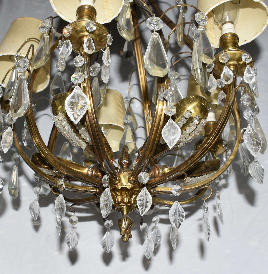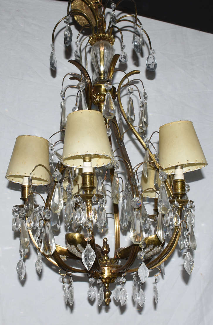 Lustre para 6 luzes, estilo Versailles, estrutura de metal dourado com pingentes e placas de cristal lapidado.