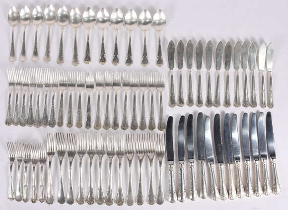 Parte de faqueiro de prata 90 Fracalanza, composto de: 12 facas e 12 garfos grandes; 12 garfos e 12 colheres de sobre...