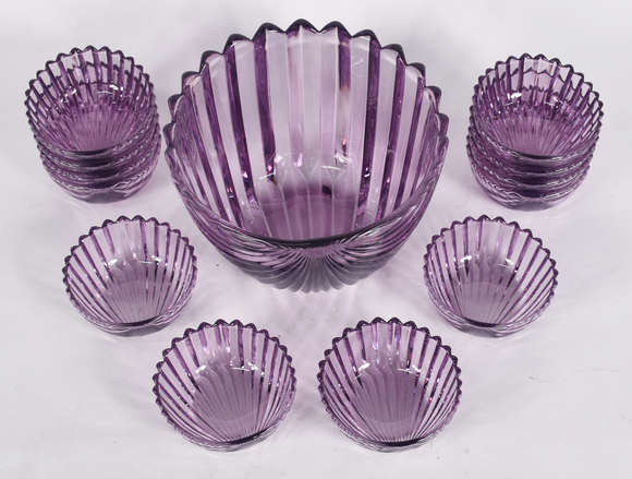 Conjunto de saladeira e 12 bowls de vidro lilás na forma de concha.
